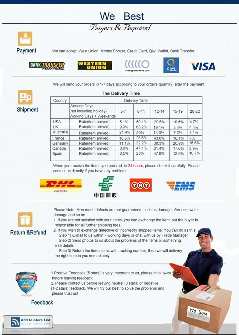 • If you did not receive the product within the guaranteed time( 45 days not including 2-5 day processing) you can request a refund or a reshipment.