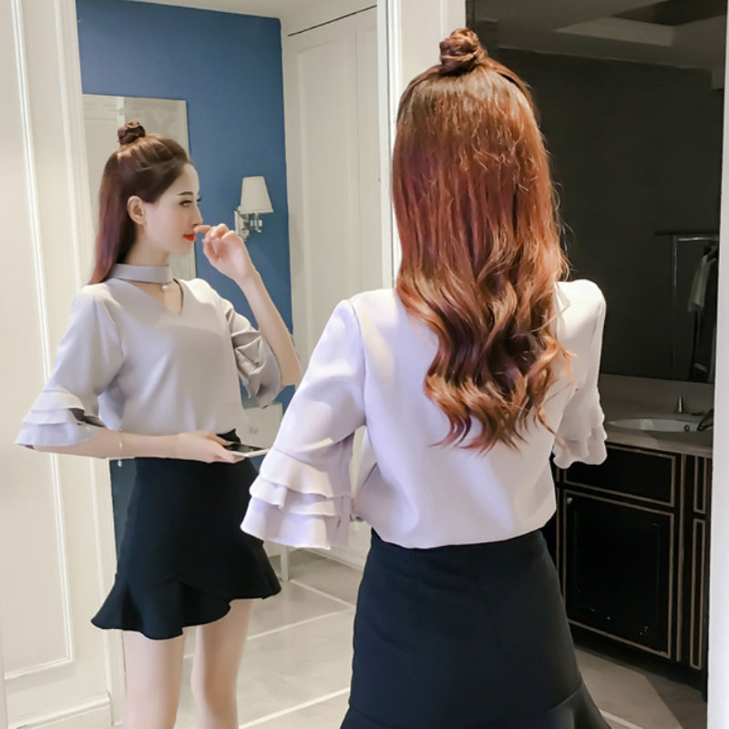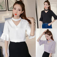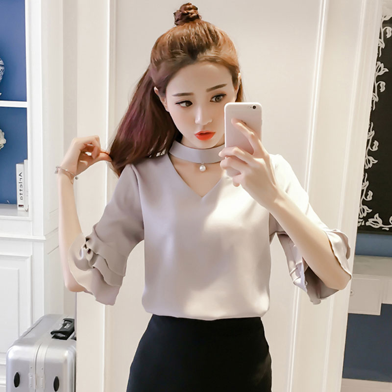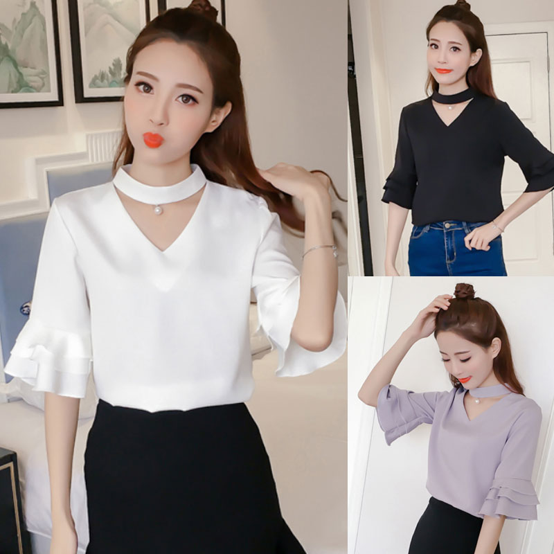 Product Name : Flare Sleeve Blouse Summer 2018 New Arrival Solid Chiffon Blouses For Women Tops Choker Beading Korean Casual Short Sleeve Shirt