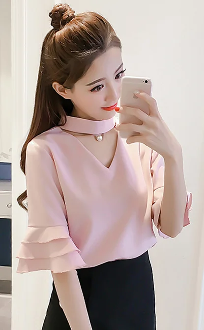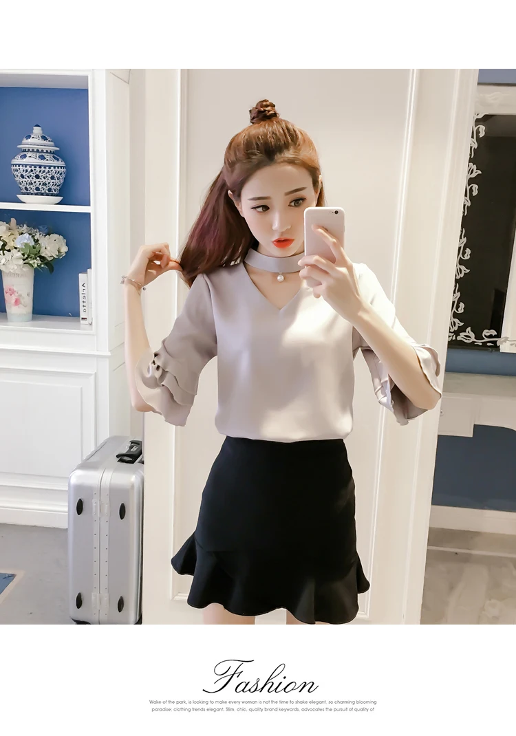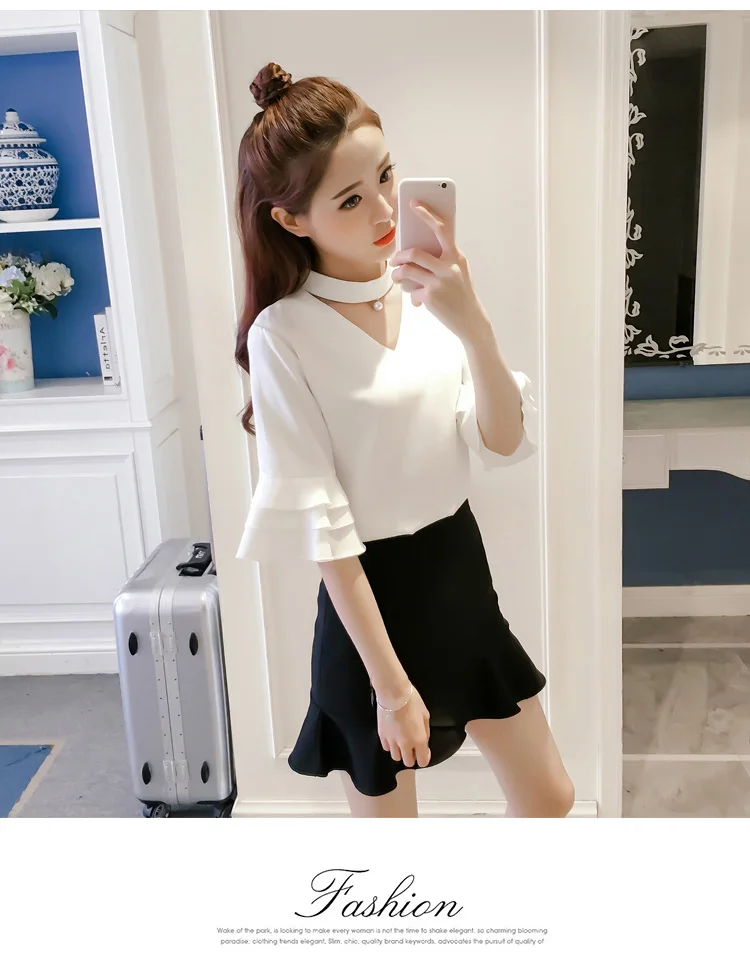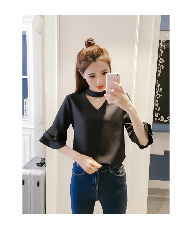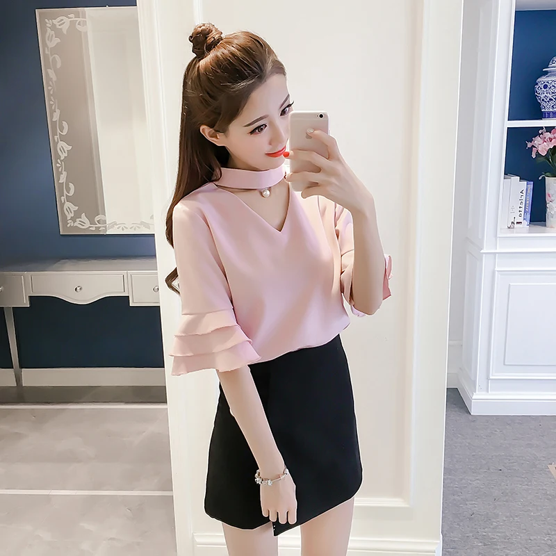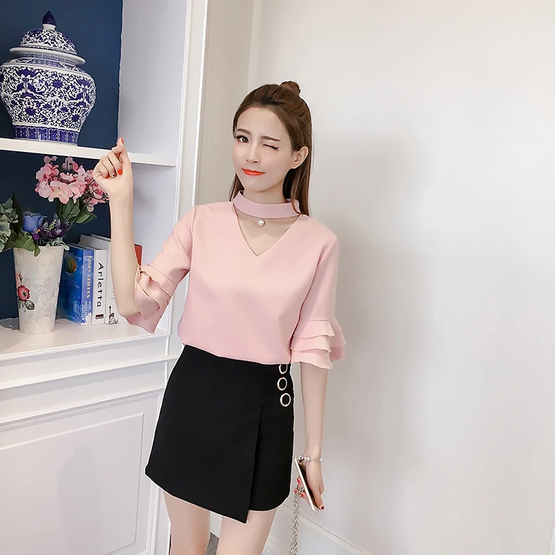 Product Name : Flare Sleeve Blouse Summer 2018 New Arrival Solid Chiffon Blouses For Women Tops Choker Beading Korean Casual Short Sleeve Shirt