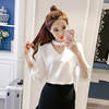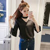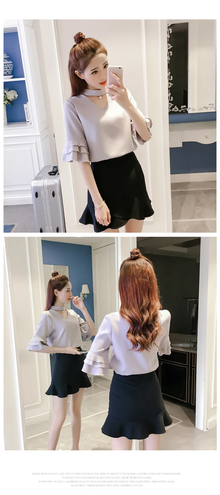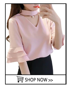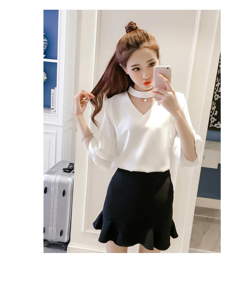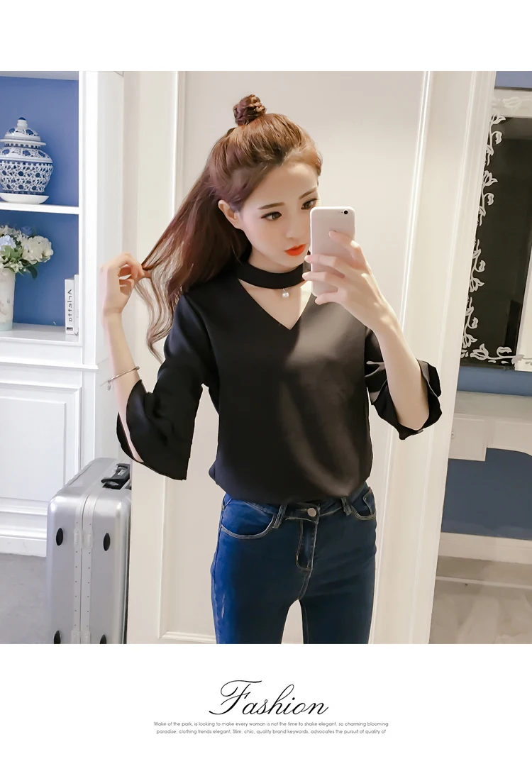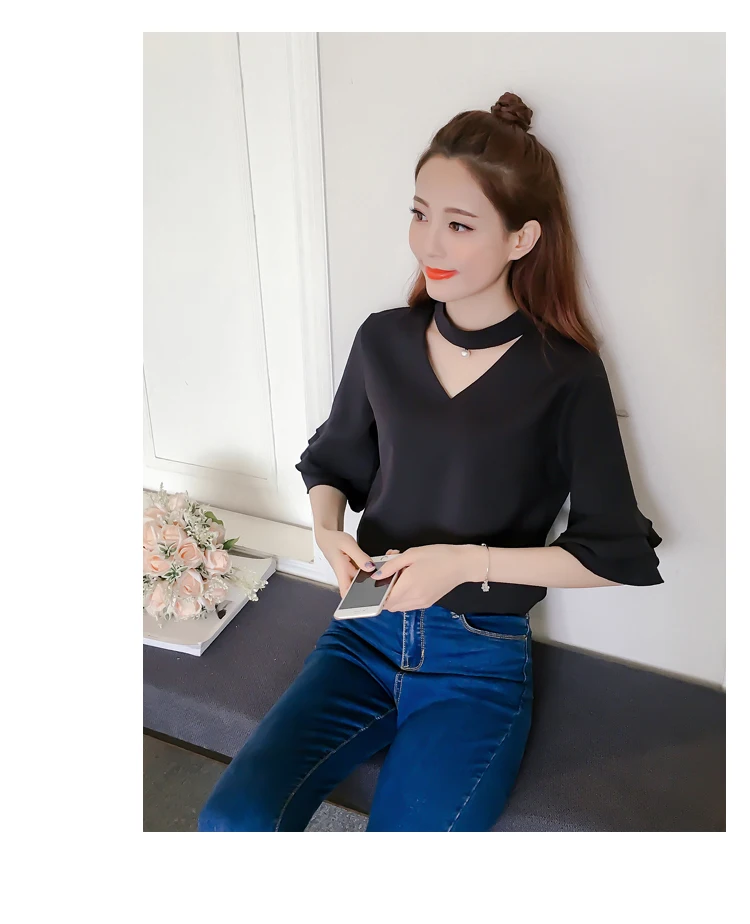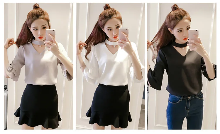 Product Name : Flare Sleeve Blouse Summer 2018 New Arrival Solid Chiffon Blouses For Women Tops Choker Beading Korean Casual Short Sleeve Shirt