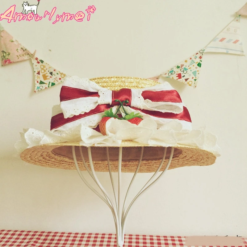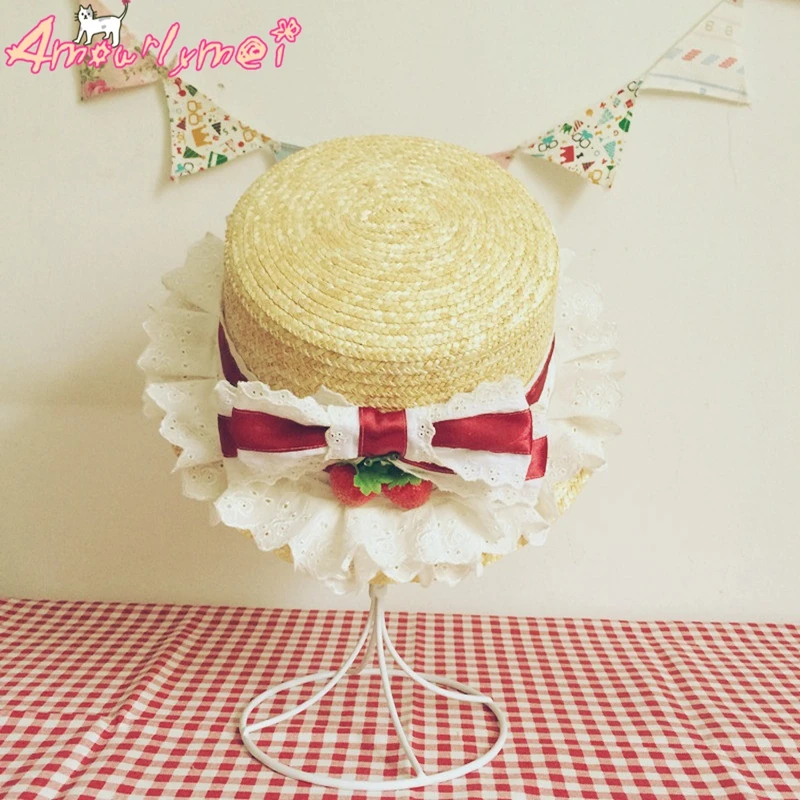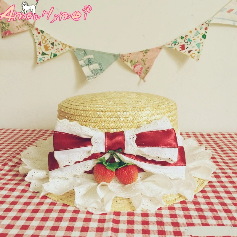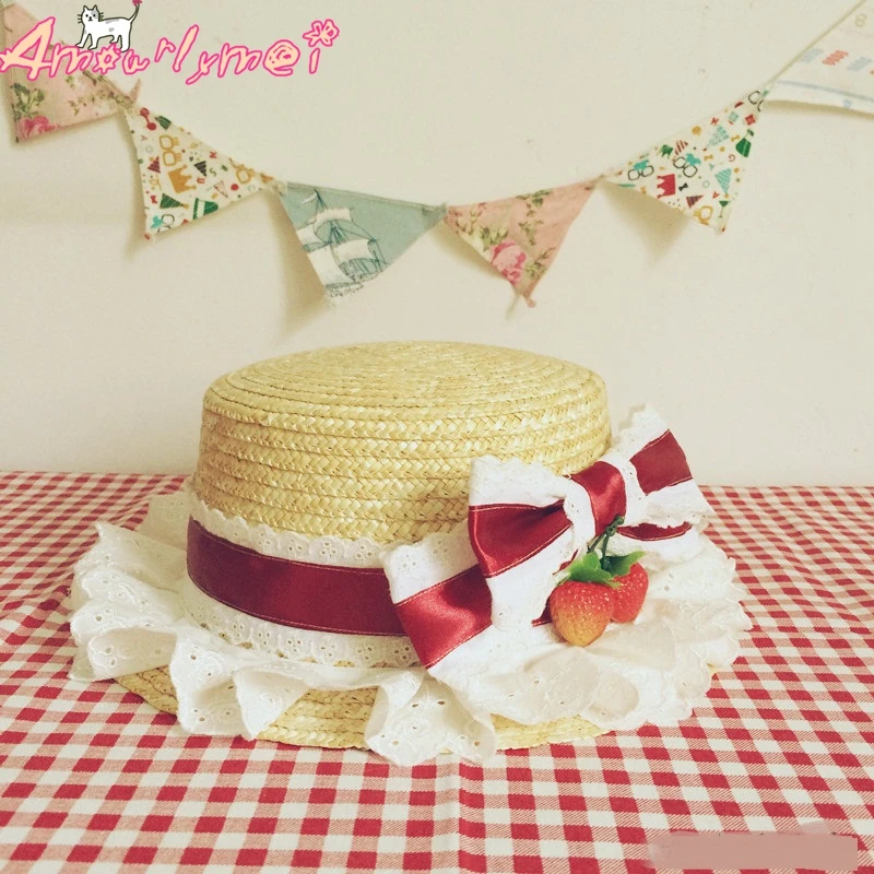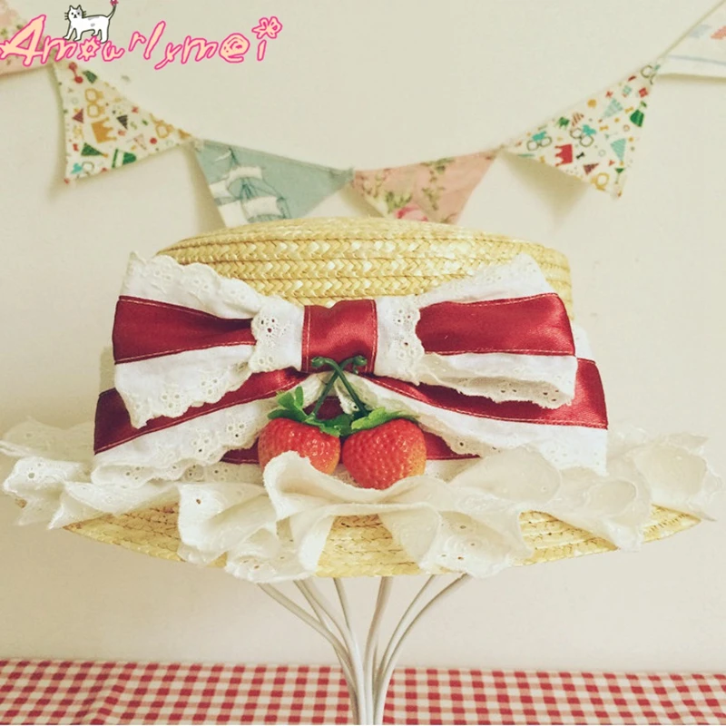 Flat Hats For Women Girl Summer Beach Hat Japanese Style Lolita Kawaii Bow Strawberry Lace Straw Hat Female Casual Cap With Bag