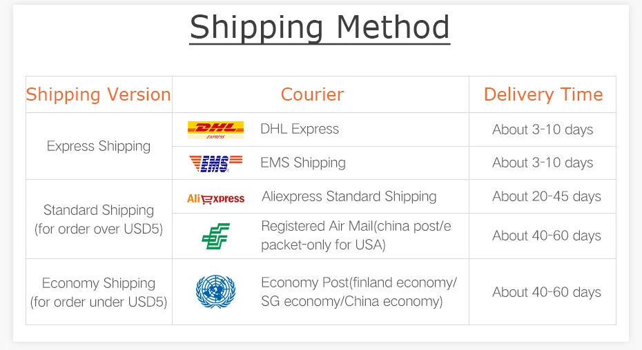 Packages from our warehouse in China will be shipped by ePacket or EMS depending on the weight and size of the product. Packages shipped from our US warehouse are shipped through USPS.