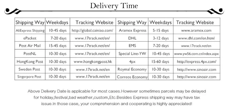 Packages from our warehouse in China will be shipped by ePacket or EMS depending on the weight and size of the product. Packages shipped from our US warehouse are shipped through USPS.