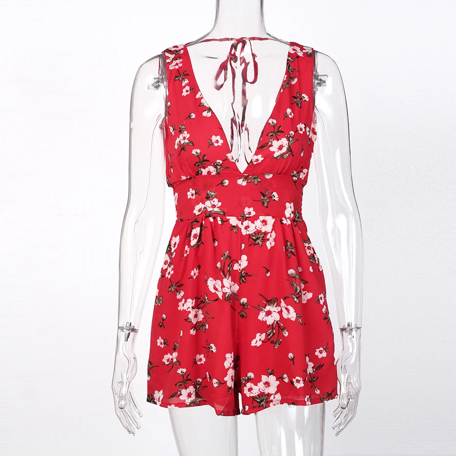 Floral Print Women Rompers Summer 2018 Sleeveless Chiffon Jumpsuit Short Backless Deep V Neck Casual Sexy Romper Womens Playsuit