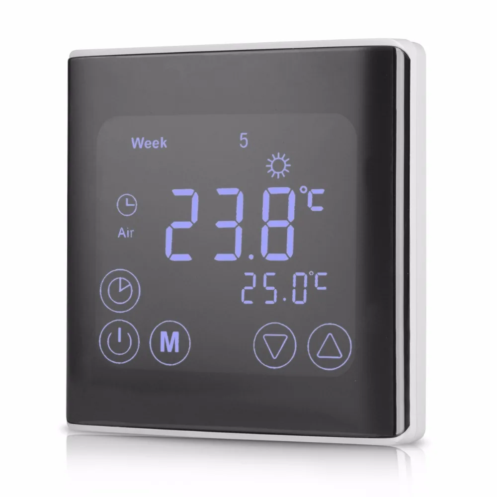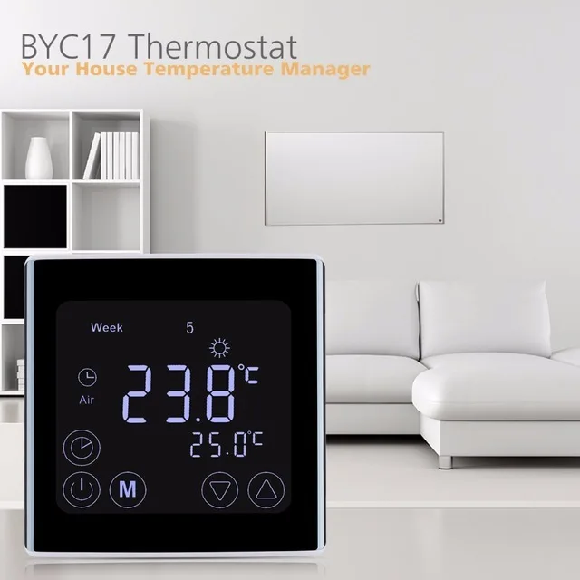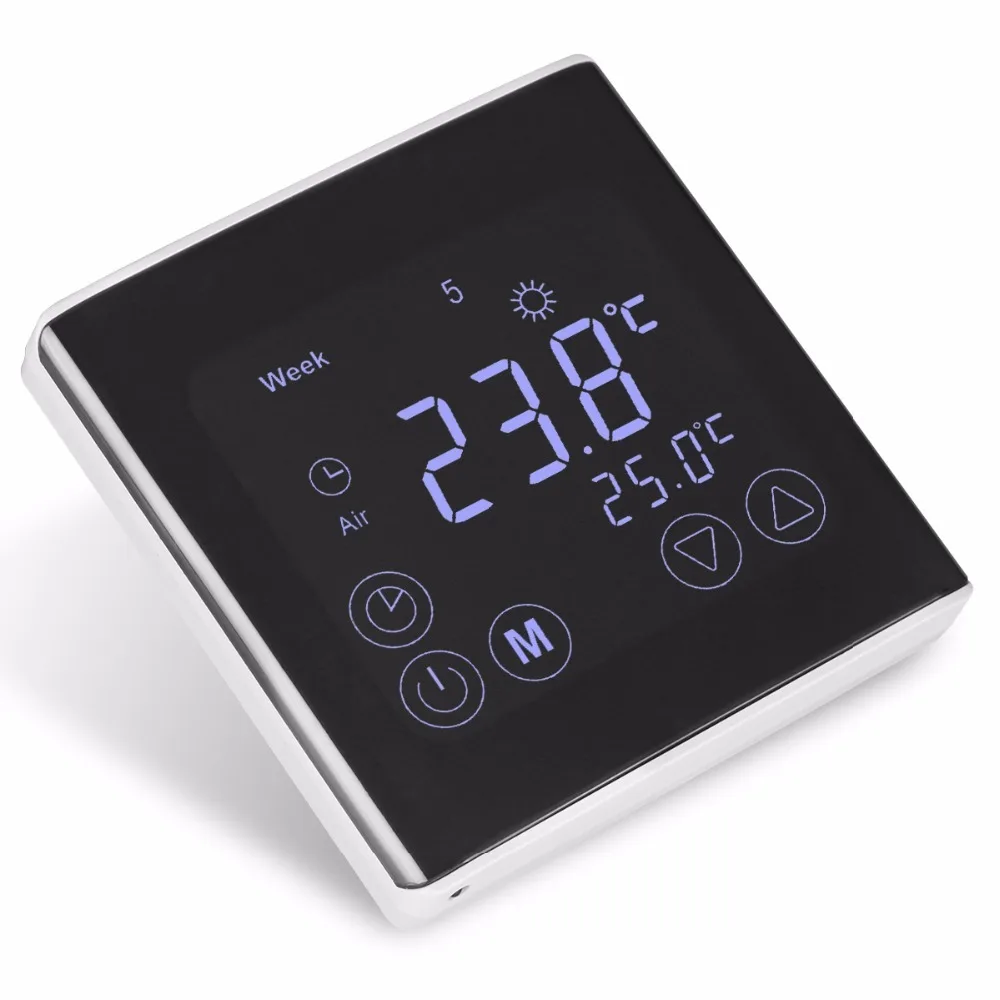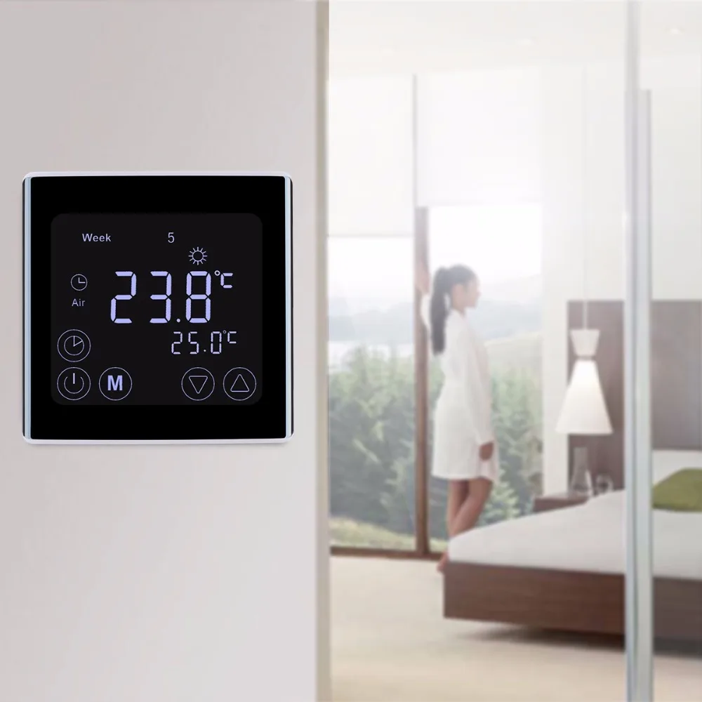 This heating thermostat with weekly programming adopts the latest single-chip computer control technology, and its application is the electric heating equipment or actuator control. According to the preset temperature, the thermostat will automatically start and stop the controlled object (Valve, Floor heating, the Heating wall, Electric heater etc). This thermostat has a thinner, sleeker design, and the large square LCD screen ensures a better user experience of temperature control.