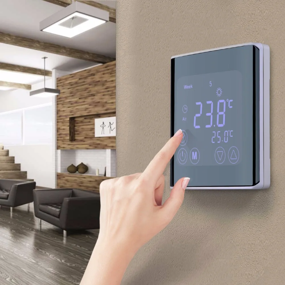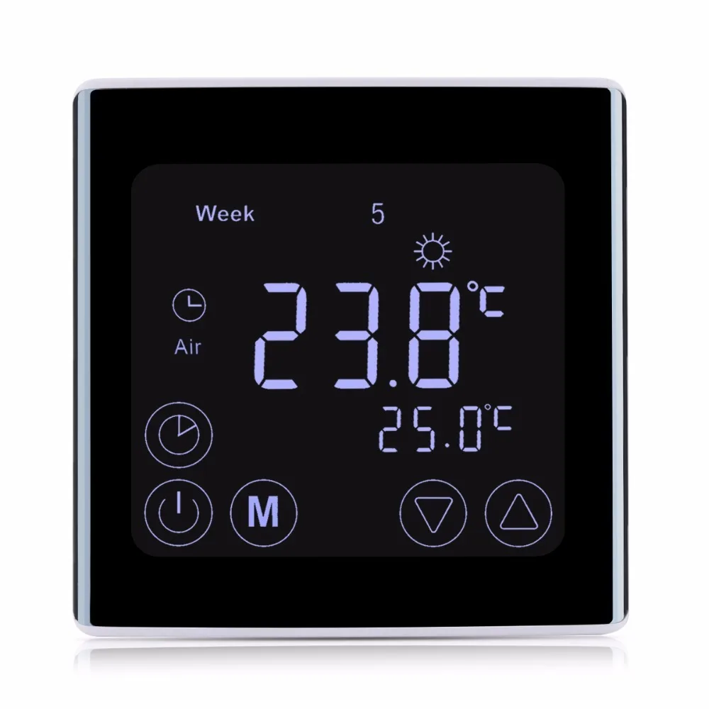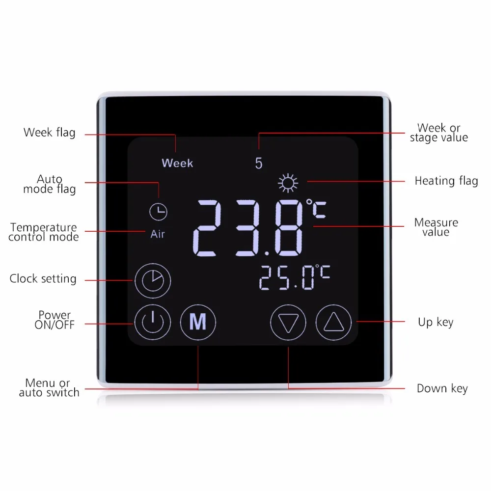 This heating thermostat with weekly programming adopts the latest single-chip computer control technology, and its application is the electric heating equipment or actuator control. According to the preset temperature, the thermostat will automatically start and stop the controlled object (Valve, Floor heating, the Heating wall, Electric heater etc). This thermostat has a thinner, sleeker design, and the large square LCD screen ensures a better user experience of temperature control.