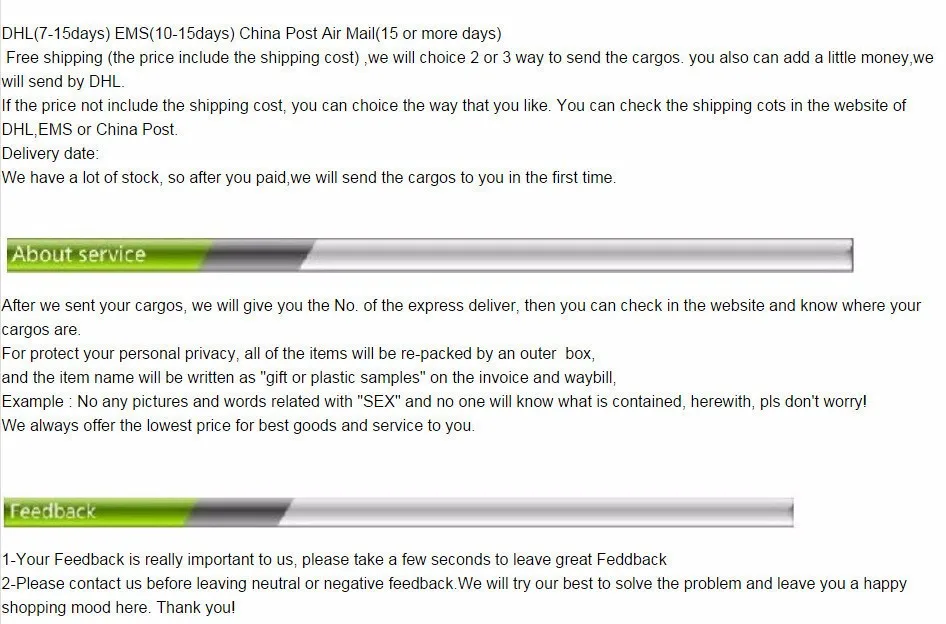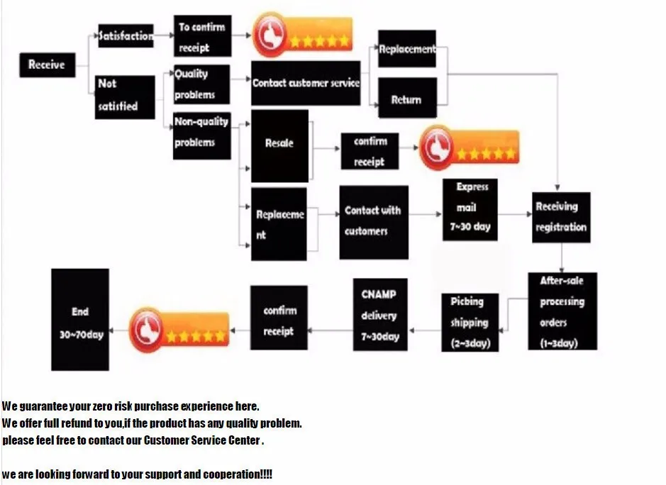 • If you did not receive the product within the guaranteed time( 45 days not including 2-5 day processing) you can request a refund or a reshipment.
