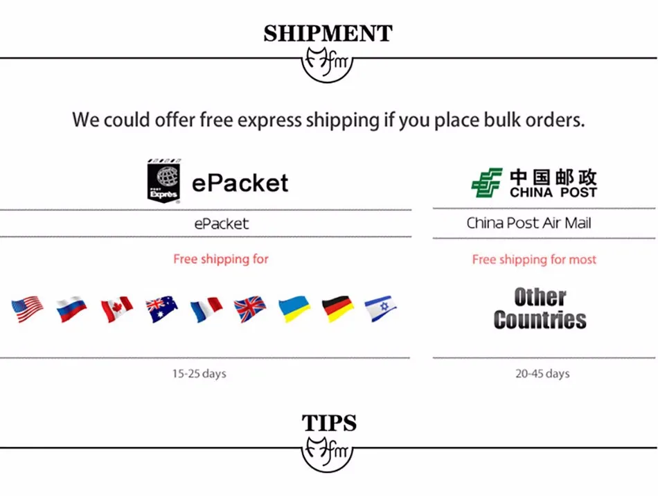 Packages from our warehouse in China will be shipped by ePacket or EMS depending on the weight and size of the product. Packages shipped from our US warehouse are shipped through USPS.