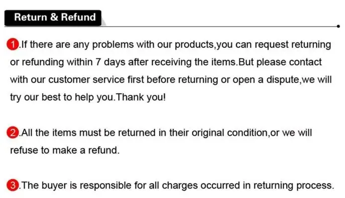 • If you do not want the product you’ve received you may request a refund but you must return the item at your expense and the item must be unused.