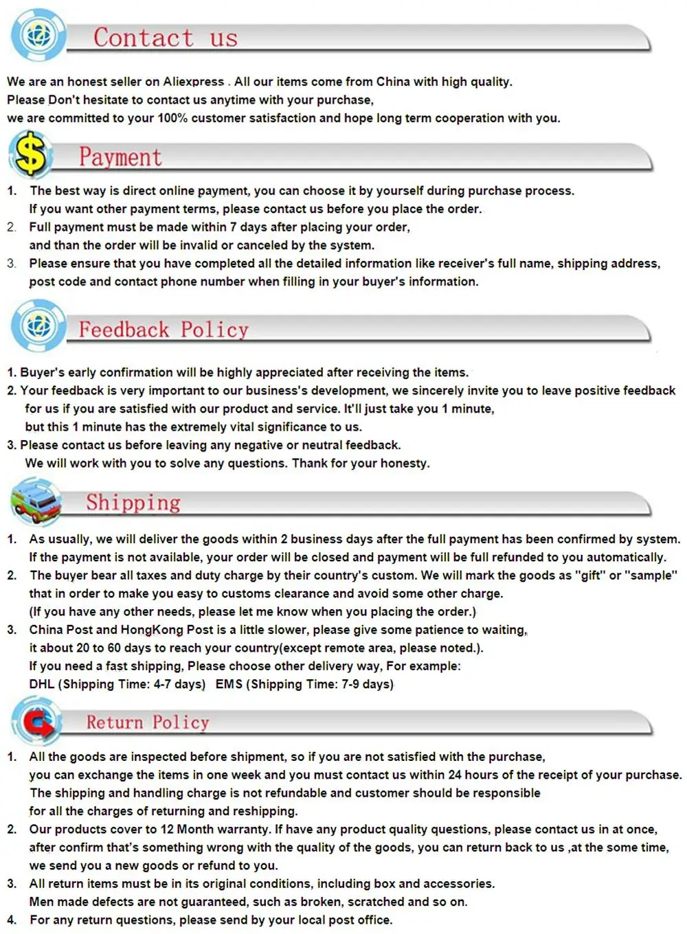 If for any reason you would like to exchange your product, perhaps for a different size in clothing. You must contact us first and we will guide you through the steps.