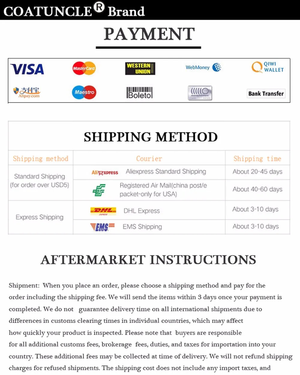 We are not responsible for any custom fees once the items have shipped. By purchasing our products, you consent that one or more packages may be shipped to you and may get custom fees when they arrive in your country.