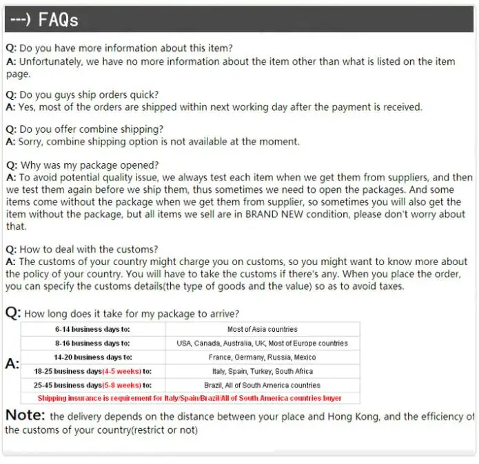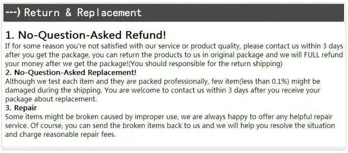 • If you did not receive the product within the guaranteed time( 45 days not including 2-5 day processing) you can request a refund or a reshipment.