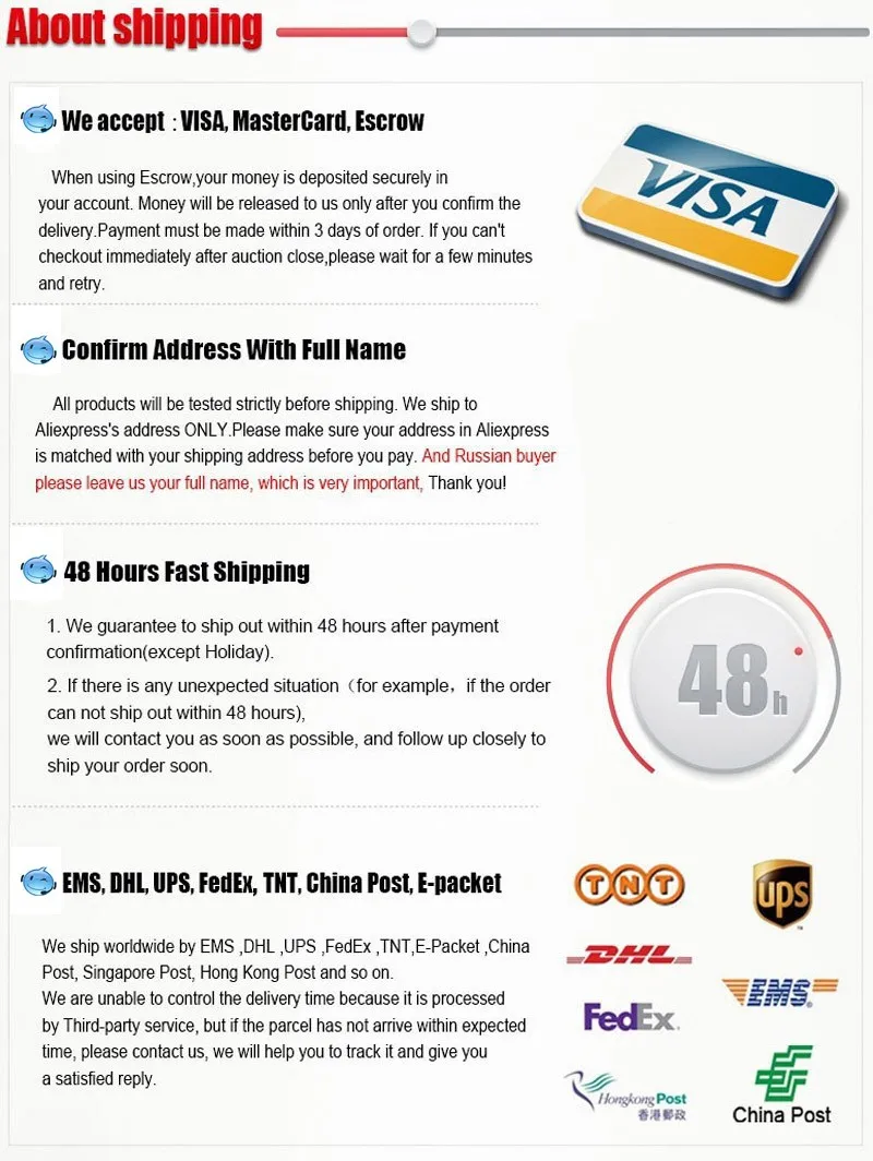 Packages from our warehouse in China will be shipped by ePacket or EMS depending on the weight and size of the product. Packages shipped from our US warehouse are shipped through USPS.