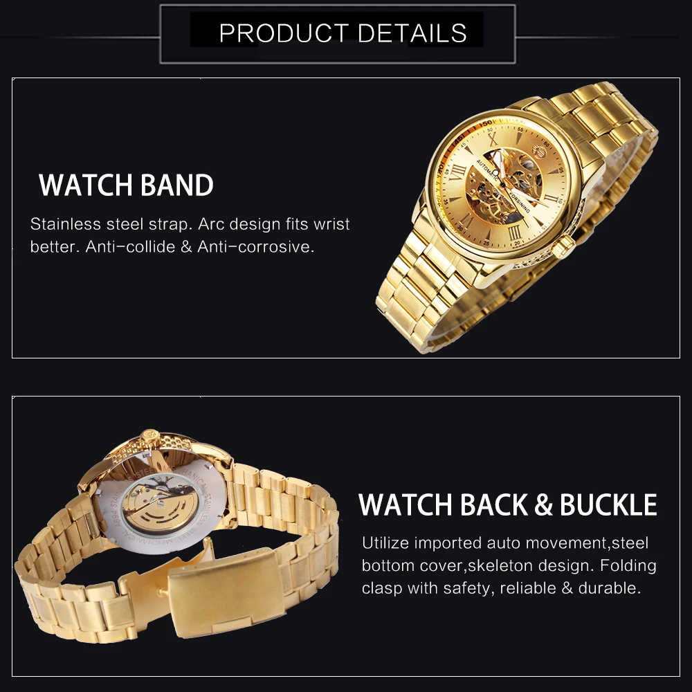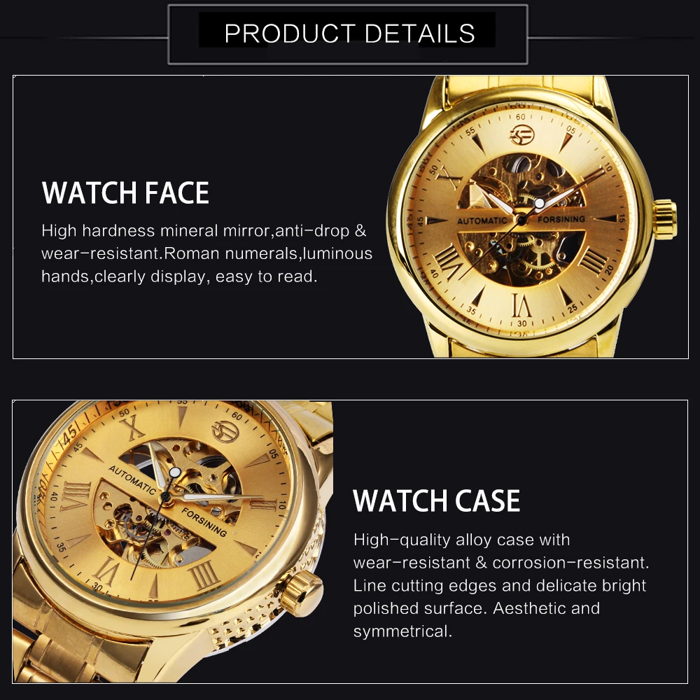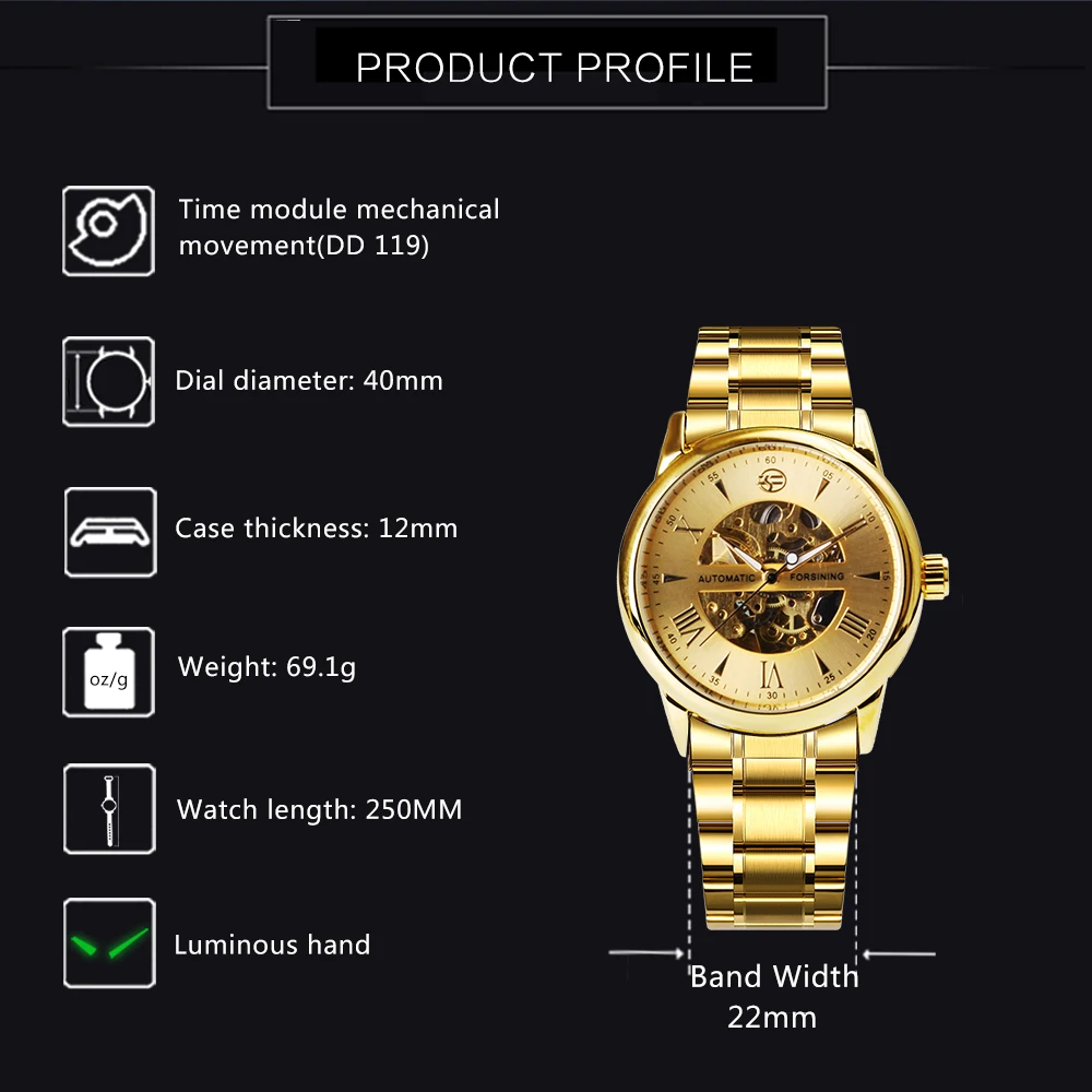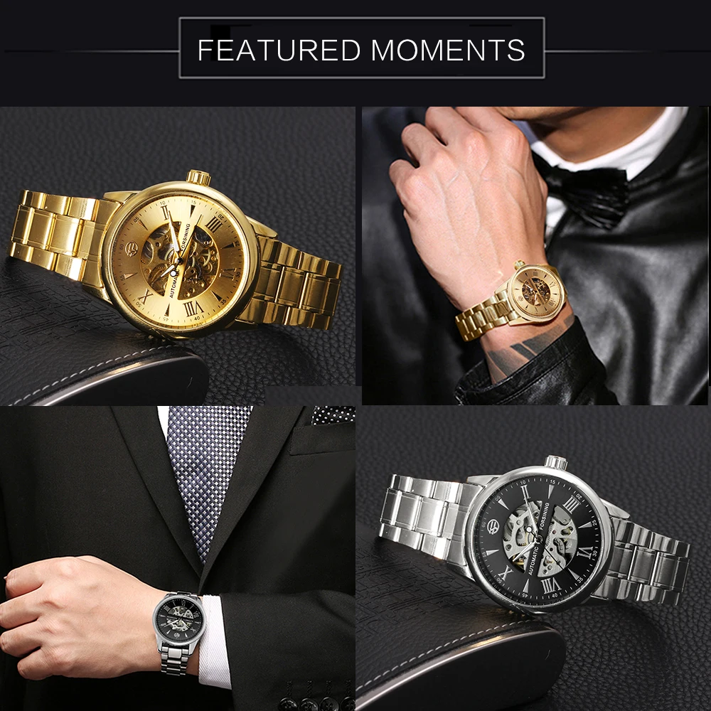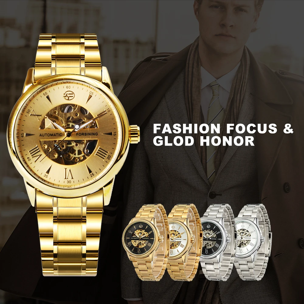 FORSINING Golden Luxury Watch Men Top Brand Full Steel Auto Mechanical Wrist Watch Roman Numerals Skeleton Clock Relojes Hombre