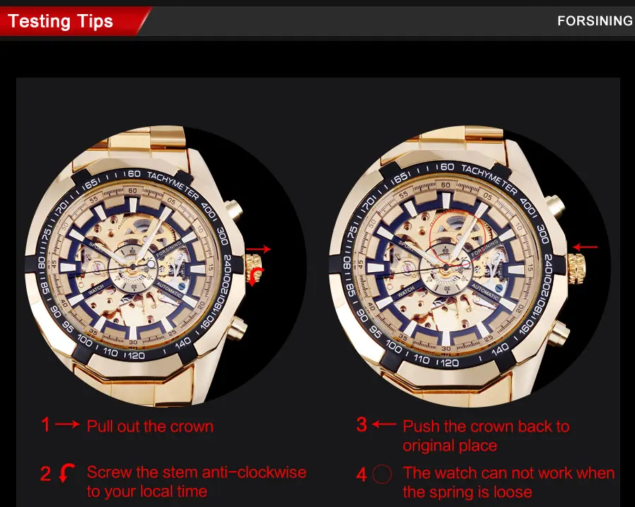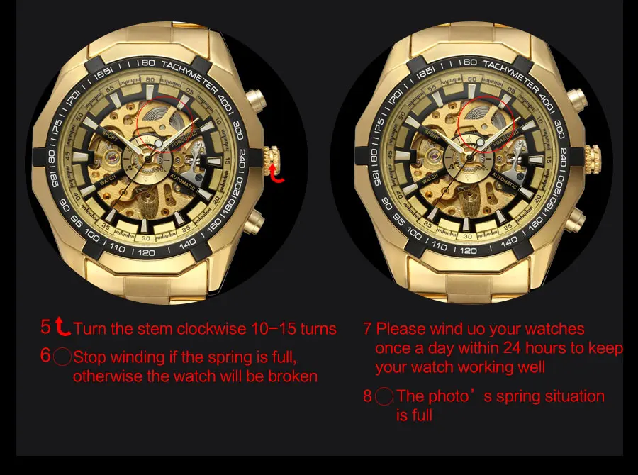 1. For self-winding mechanical watch: You need to wear it more than 8 hours to ensure it work well as the spring winded itself by the movement of your arms .If you haven’t worn it for a long time, wind it for several times, or catch the band and make your watch a horizontal direction, and sway it 30seconds quickly to make the spring available before wear it, Begin the same operation before you get off the watch every night last 1week after you buy it. The time tolerance is ±120 seconds per day in normal cases.