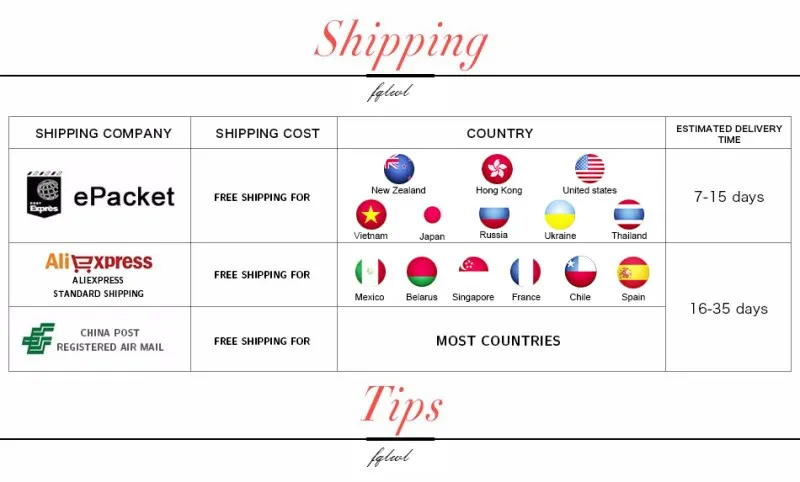 Packages from our warehouse in China will be shipped by ePacket or EMS depending on the weight and size of the product. Packages shipped from our US warehouse are shipped through USPS.