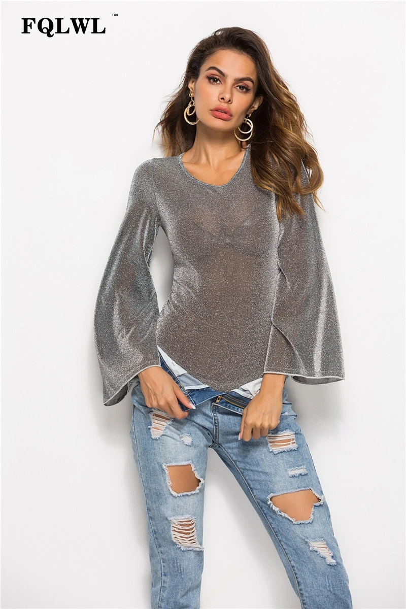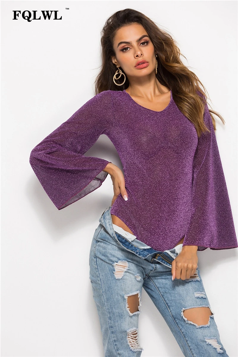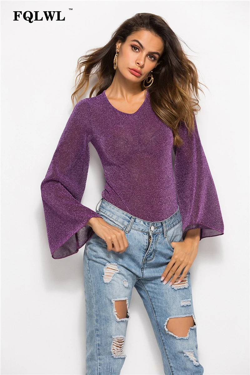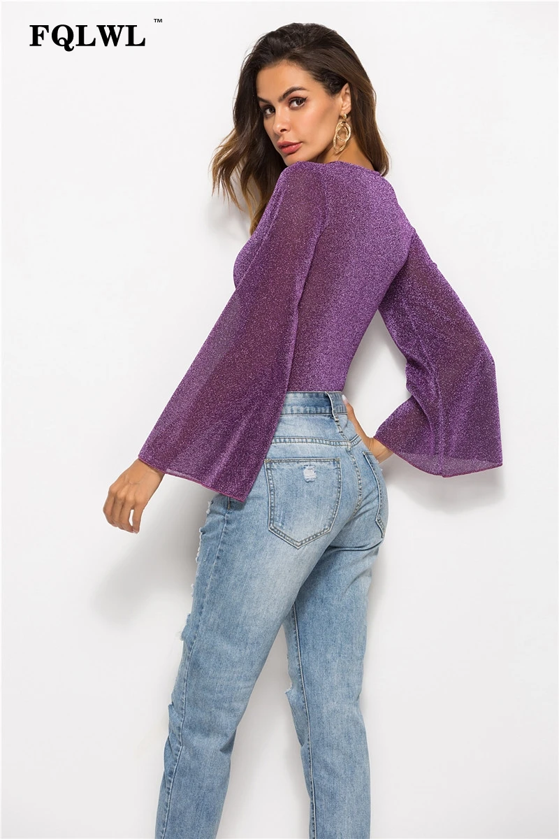FQLWL Transparent Sexy Mesh Bodysuit V Neck Flare Sleeve Bodycon Jumpsuit Summer Romper Women Top Body Femme Plus Size Bodysuit