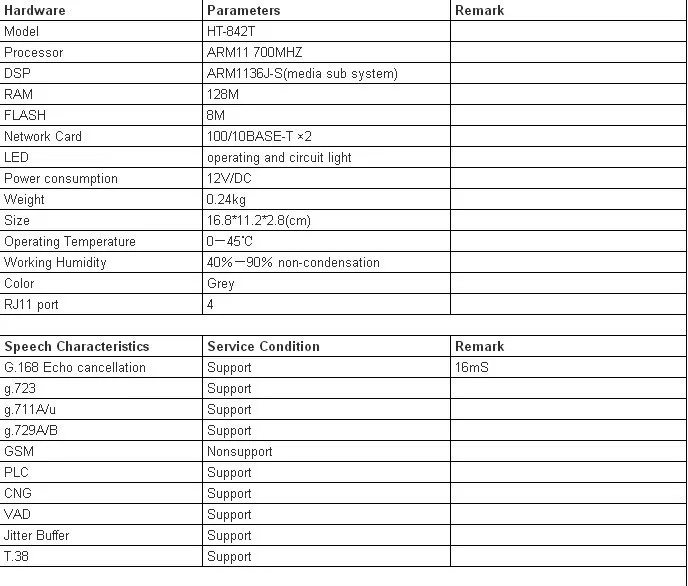 The HT-842T FXS gateway is designed as a compact ,high performance and cost-efficient VoIP Analog Termianl Adapter. The HT-842T is a full featured FXS Gateway and is designed for easy installation and configuration.It comes with one Ethernet port for network access to a VoIP Server and Four RJ-11 jack to interface with a traditional telephone or fax machine. Connecting a telephone line port (FXO) of a traditional PBX to a VoIP ATA enables the PBX to take full advantages of VoIP services. Its high performance offers toll quality voice,flexible networking feature-rich call functions.It is an ideal solution for SME, SOHO, and individual who would like to lower or eliminate their local and long distance call charges.