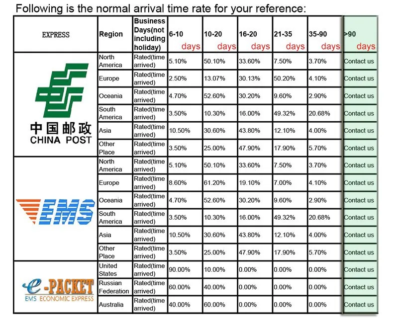 Packages from our warehouse in China will be shipped by ePacket or EMS depending on the weight and size of the product. Packages shipped from our US warehouse are shipped through USPS.