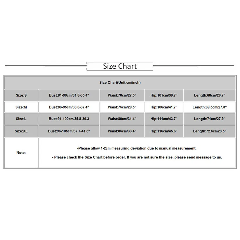 Size:S Bust:81-90cm/31.8-35.4″ Waist:70cm/27.5″ Hip:101cm/39.7″ Length:68cm/26.7″