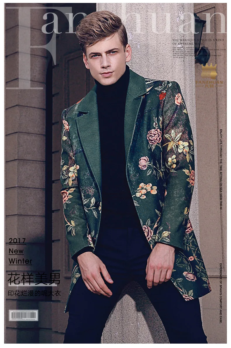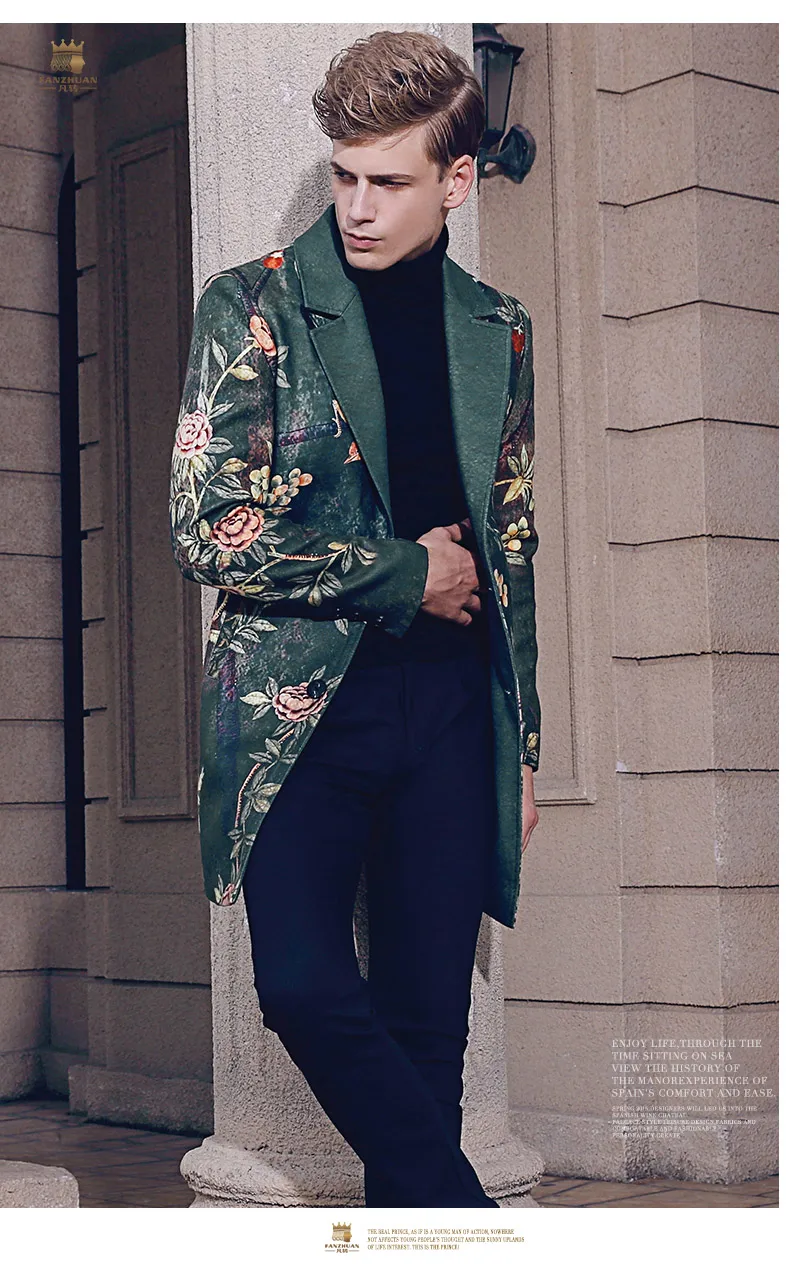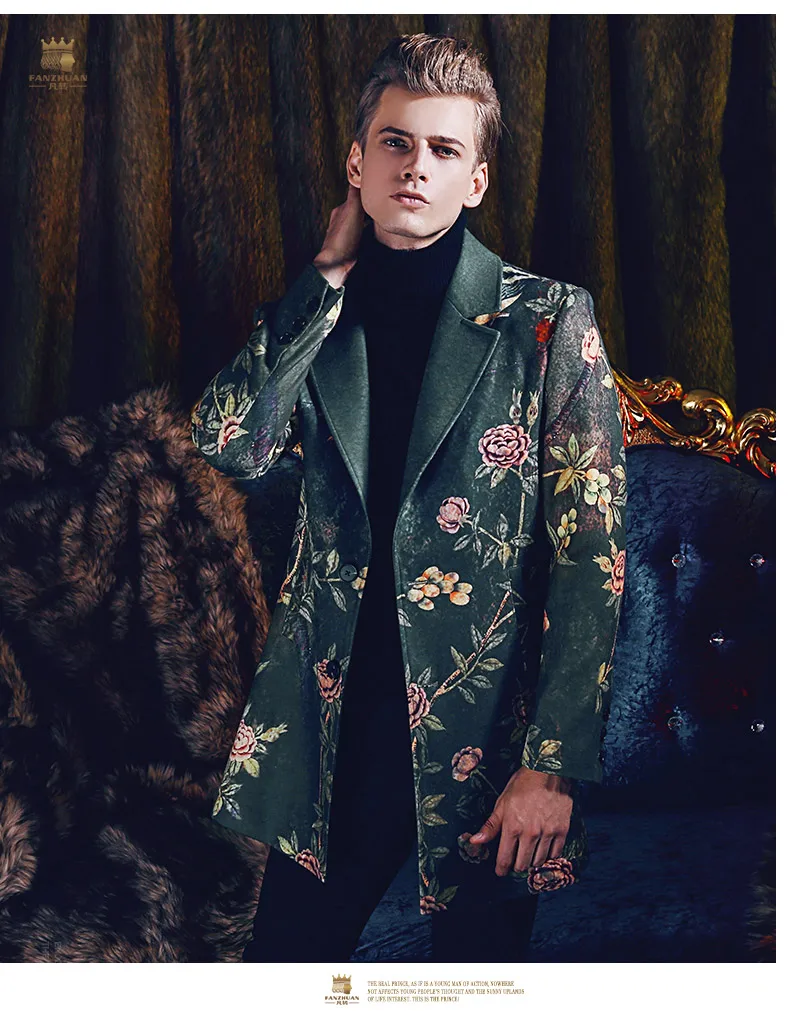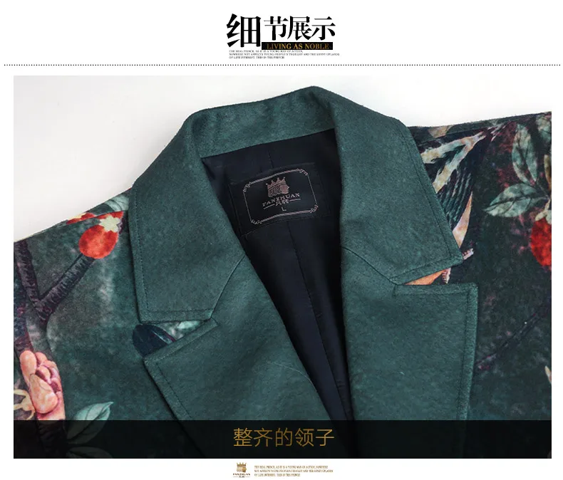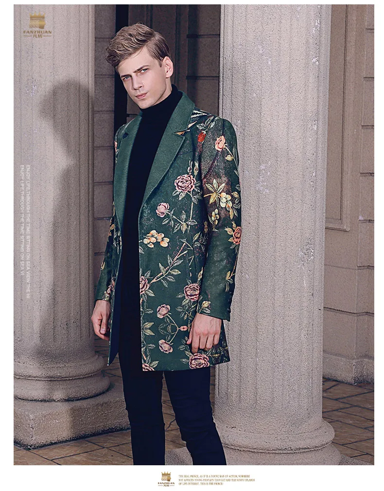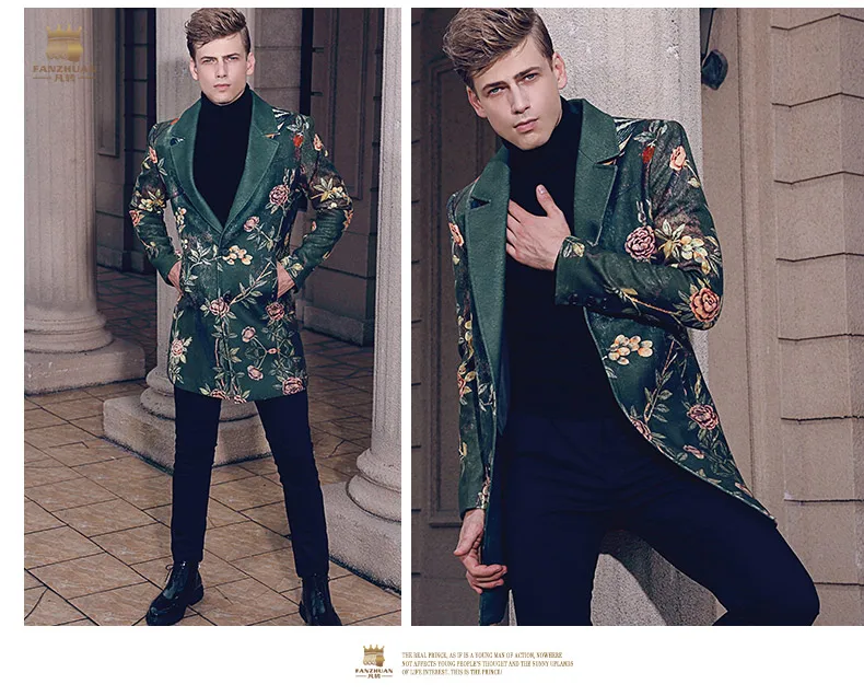 Free Shipping fanzhuan New 2017 fashion casual man male Men’s Winter printed suit style collar hair green long coat 710172