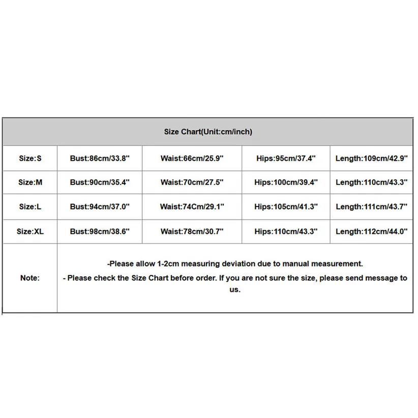 Size:XL Bust:98cm/38.6” Waist:78cm/30.7″ Hips:110cm/43.3” Length:112cm/44.0″