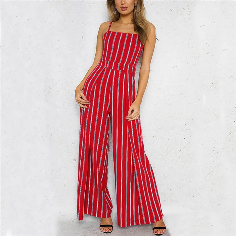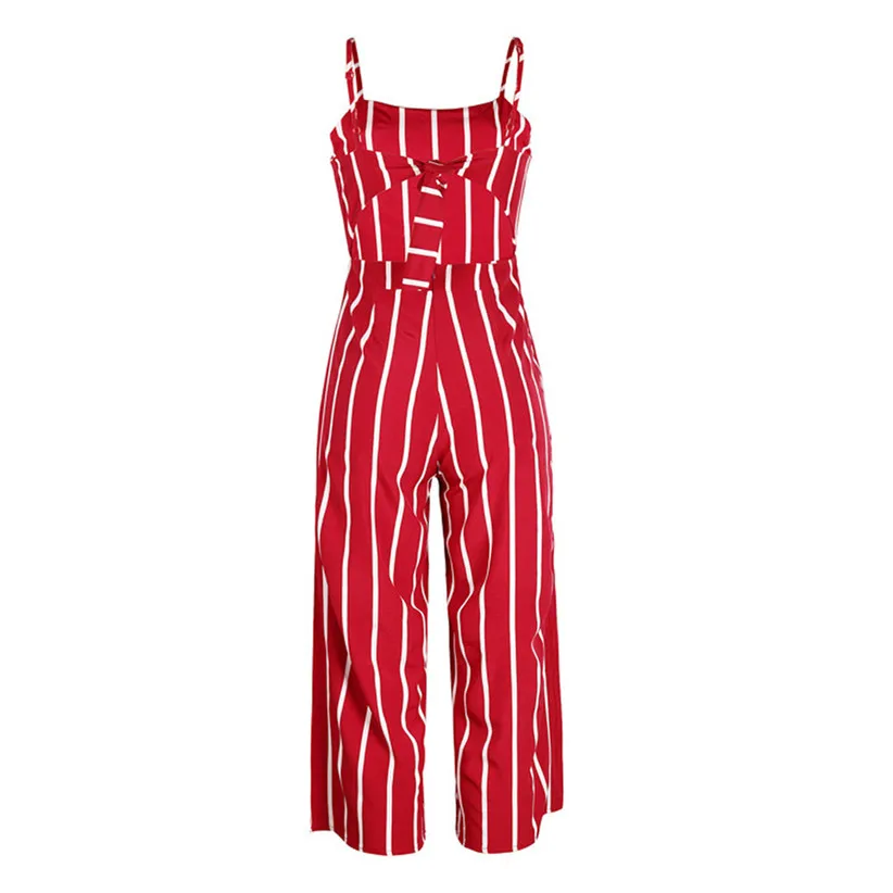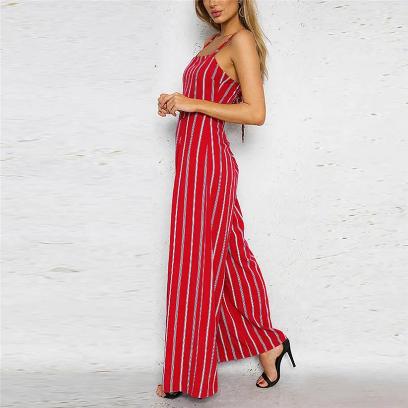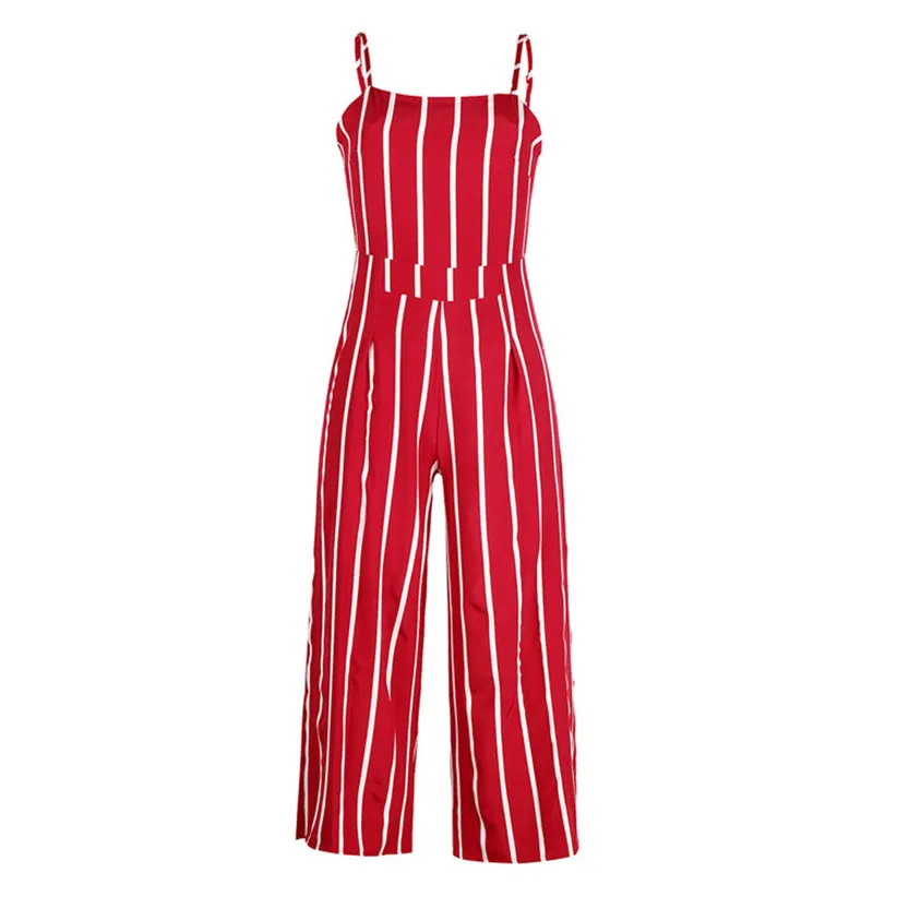 Free Shipping Women Fashion Vintage Sleeveless Strappy Striped Jumpsuit Wide Leg Pants Trousers Red Rompers 80509 Drop Shipping
