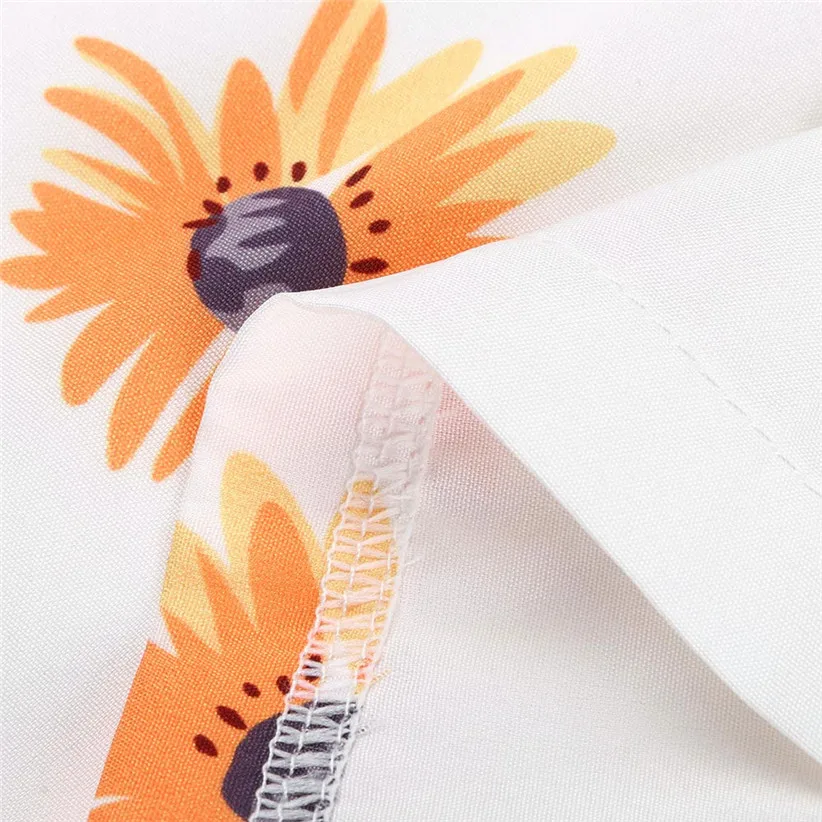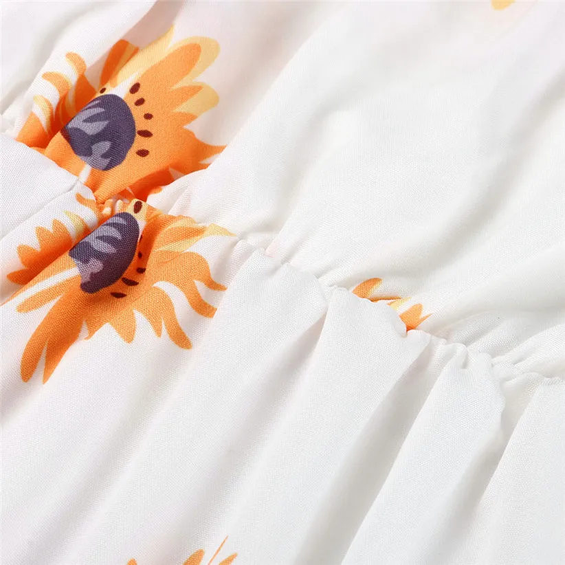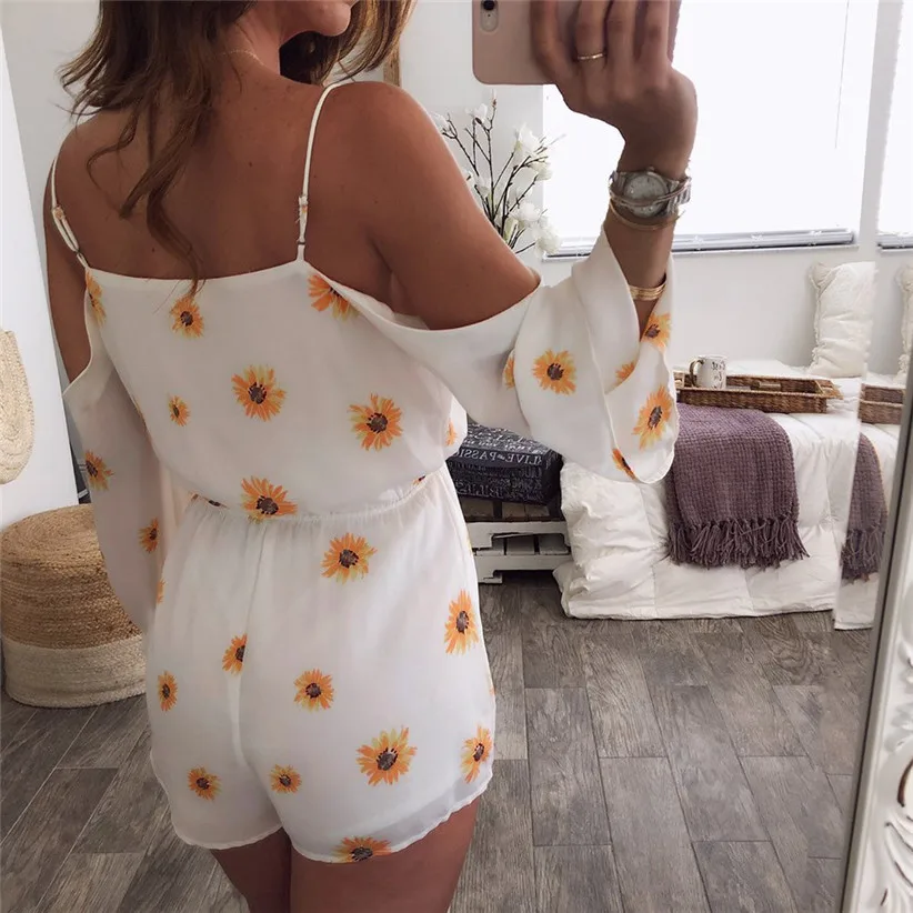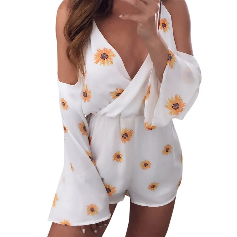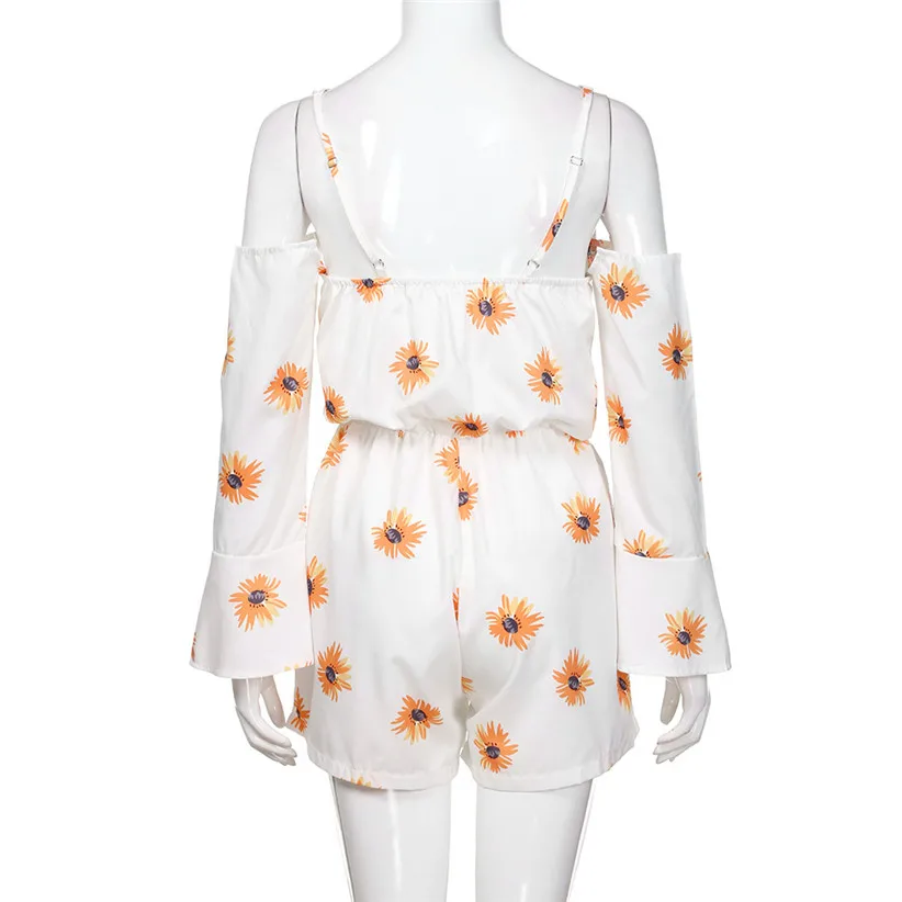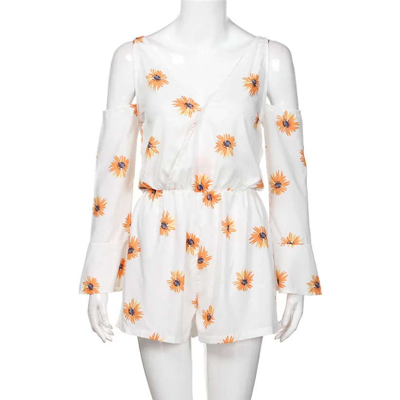 Free Shipping Women Newly Mini Sunflower Print V Neck Flare Long Sleeve Off Shoulder Playsuit White Jumpsuit 80516 Drop Shipping