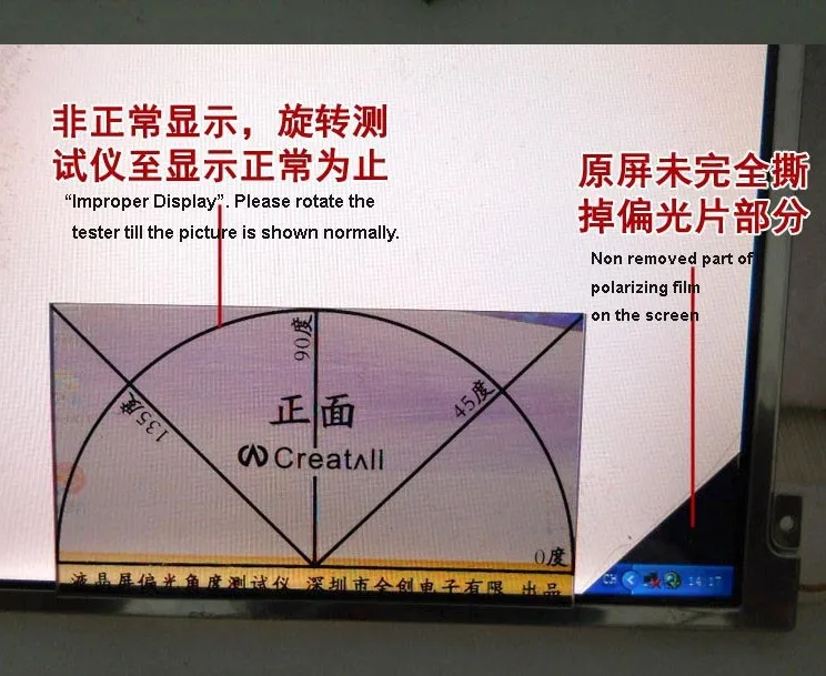 Removed the polarizer film and put the tester on the part.Then rotate the tester till the picture show properly.