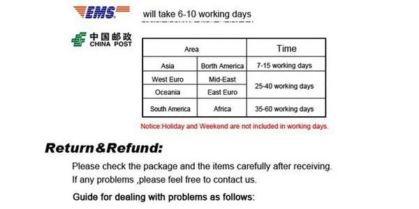 • If you did not receive the product within the guaranteed time( 45 days not including 2-5 day processing) you can request a refund or a reshipment.