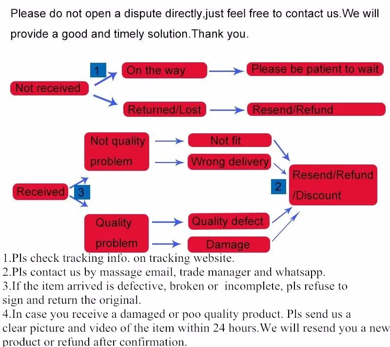 • If you did not receive the product within the guaranteed time( 45 days not including 2-5 day processing) you can request a refund or a reshipment.