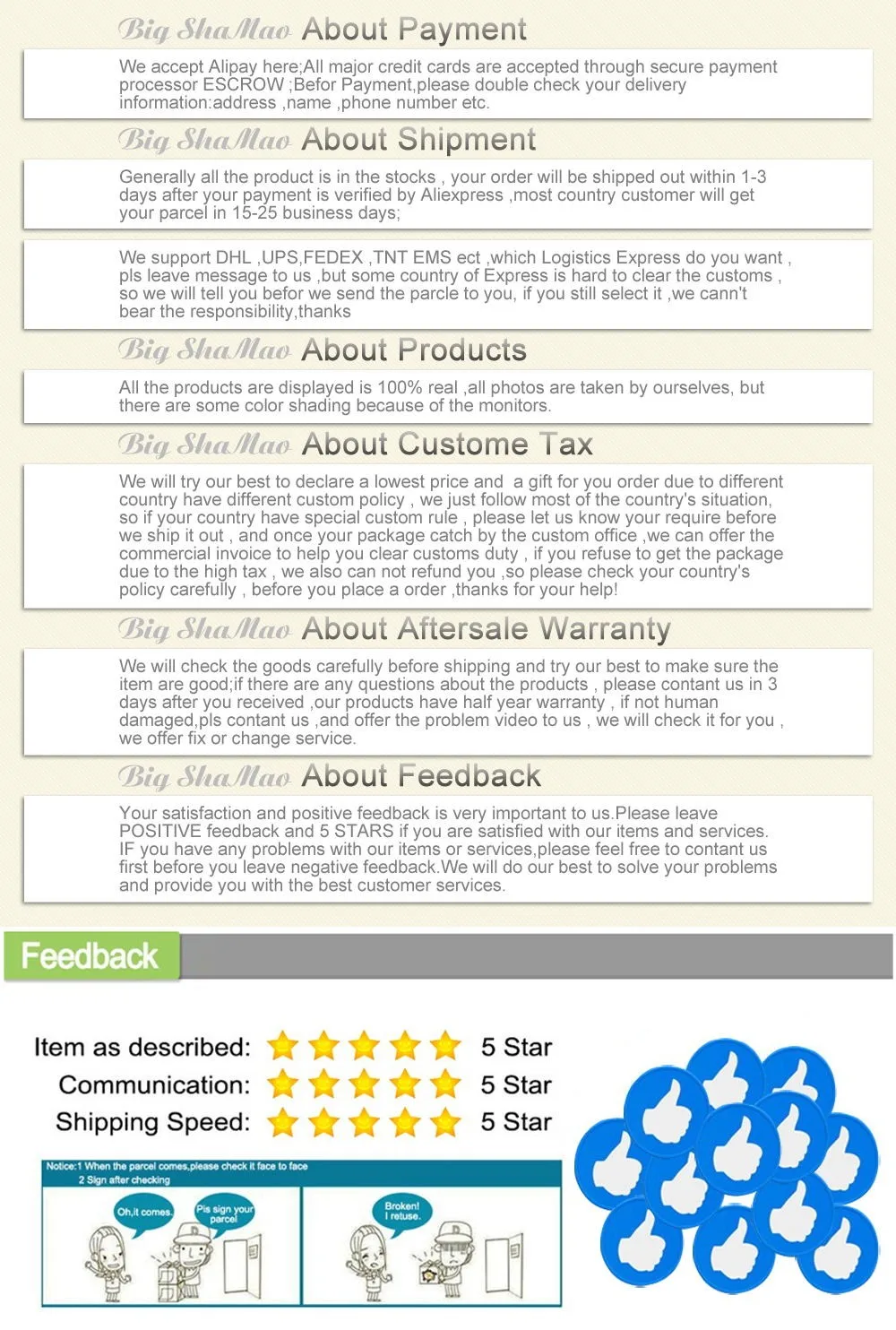 We are not responsible for any custom fees once the items have shipped. By purchasing our products, you consent that one or more packages may be shipped to you and may get custom fees when they arrive in your country.