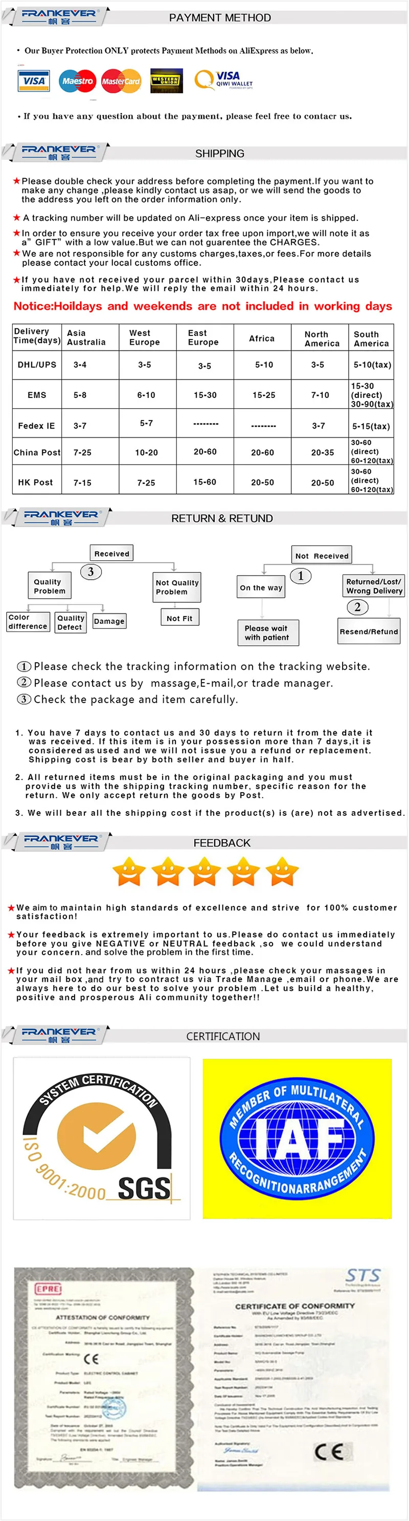 • If you did not receive the product within the guaranteed time( 45 days not including 2-5 day processing) you can request a refund or a reshipment.