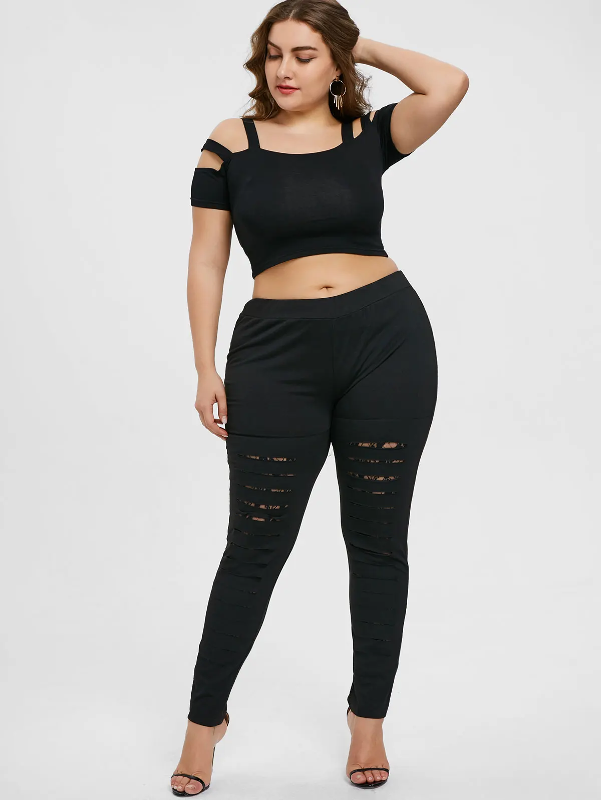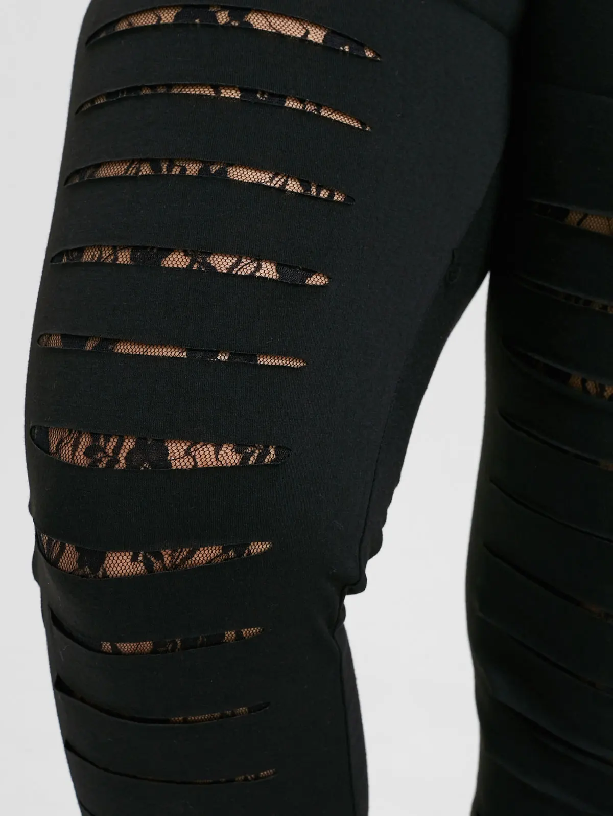 Gamiss Plus Size 5XL Lace Trim Ripped Leggings Women Fashion Skinny Mid Elastic Waist Ladder Cut Out Leggings Fitted Trousers