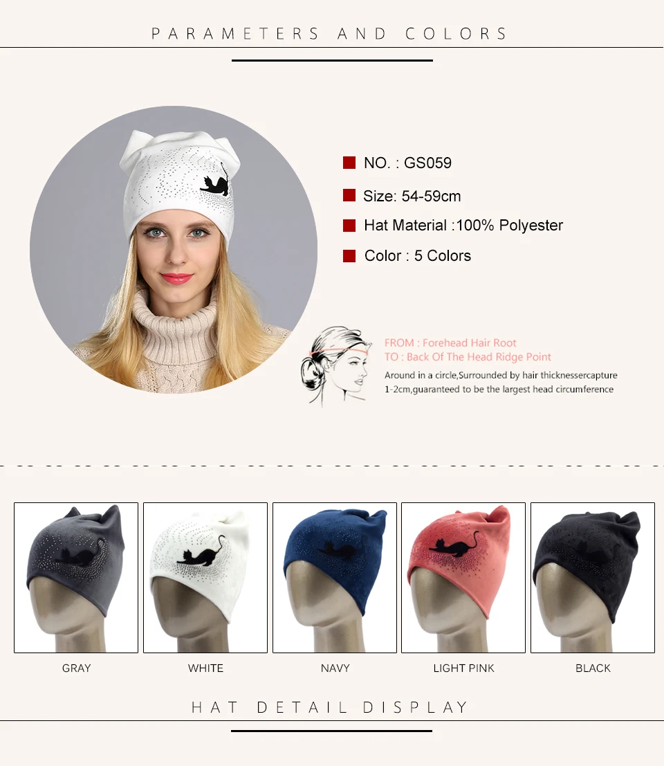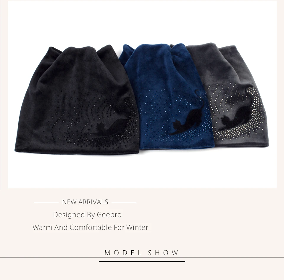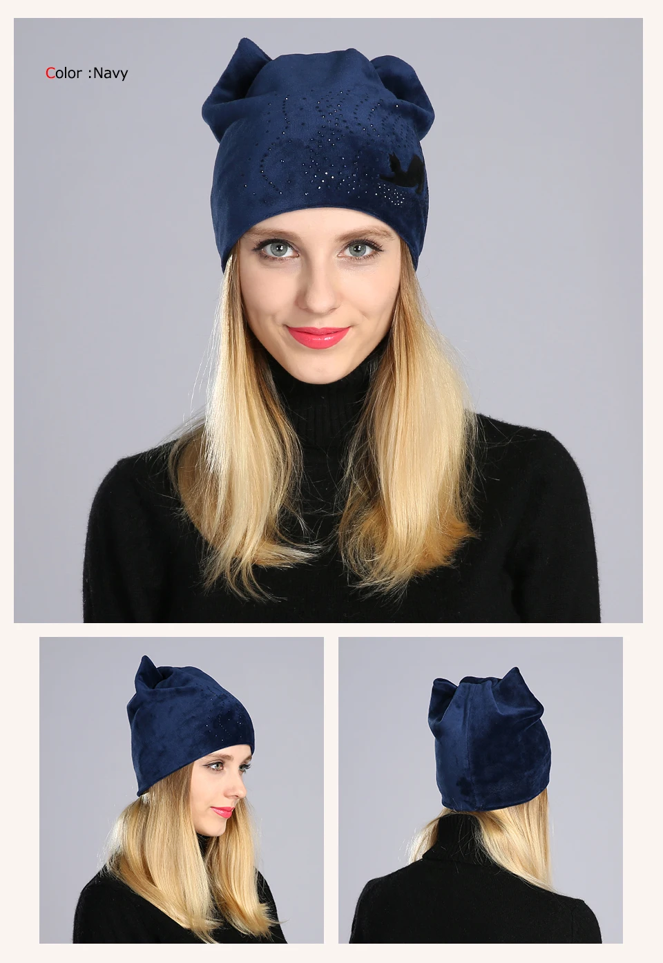 Geebro Women’s Winter Beanie Hat Casual Warm Velour Rhinestones Beanie Ladies Cat Ear Hat Female Slouchy Skullies Autumn Hat