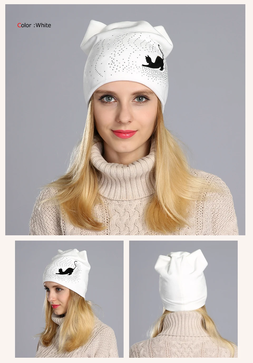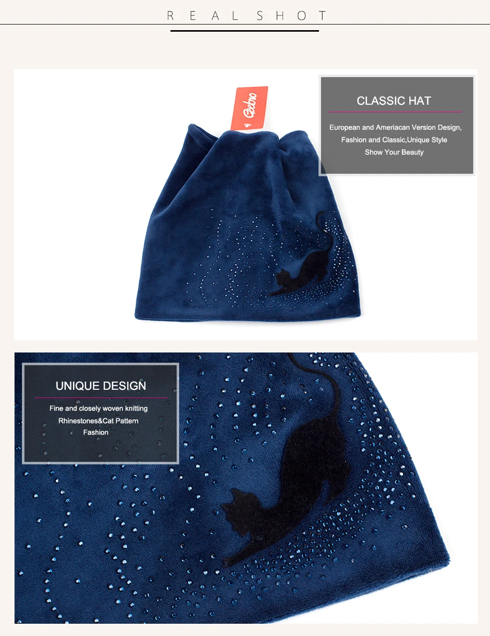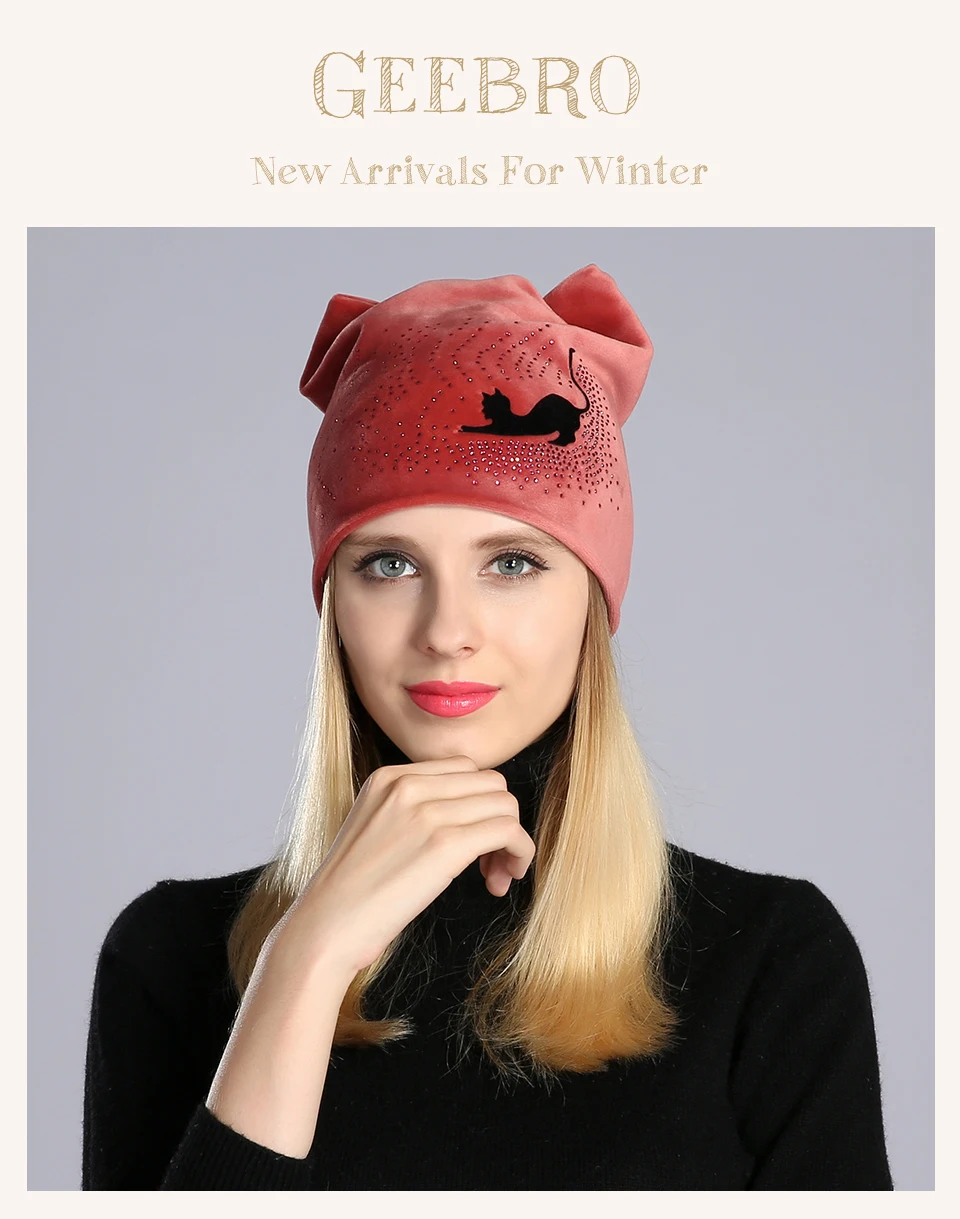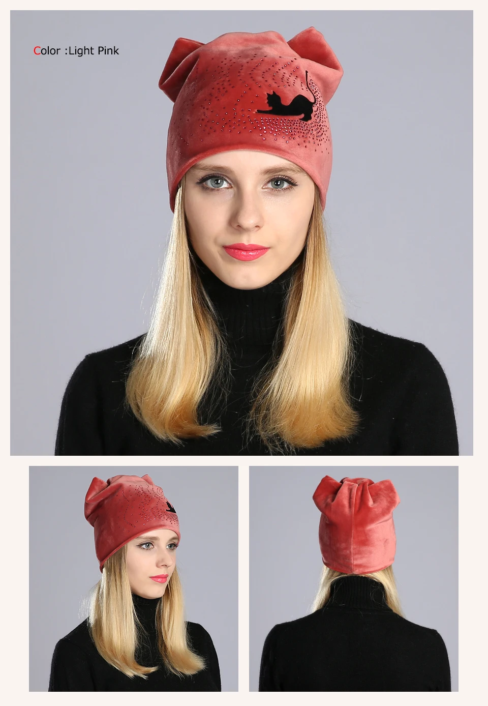 Geebro Women’s Winter Beanie Hat Casual Warm Velour Rhinestones Beanie Ladies Cat Ear Hat Female Slouchy Skullies Autumn Hat
