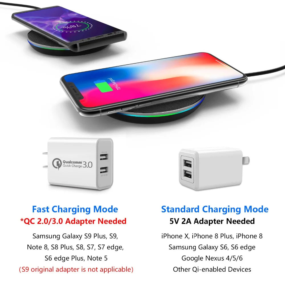 1.To enable fast wireless charging mode, Samsung original or QC 2.0/QC 3.0 adapter【9V/1.67A, not included】is required.