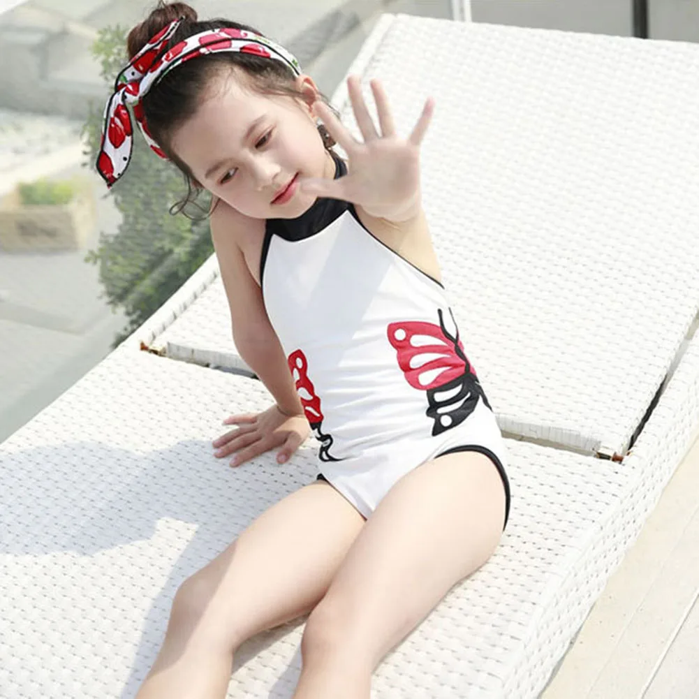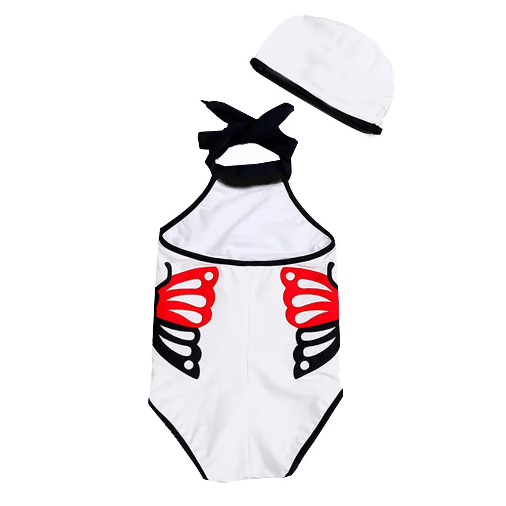 Girls One-Piece Swimsuit + Swimming Cap 2PCS Set Spandex Cute Double Butterflies Children Swimsuit Swimwear With Swimming Cap