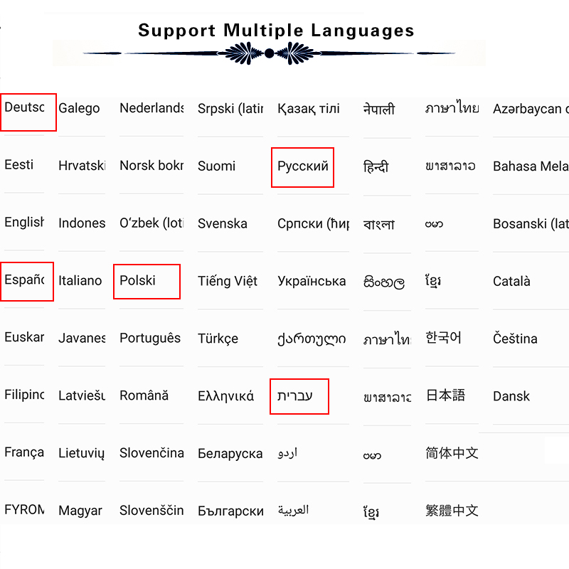 | 8.Multiple Languages——- | YES (Russian,Spanish,English,Hebrew,Arabic,French,etc) |