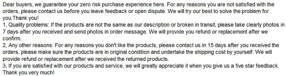 • If you did not receive the product within the guaranteed time( 45 days not including 2-5 day processing) you can request a refund or a reshipment.