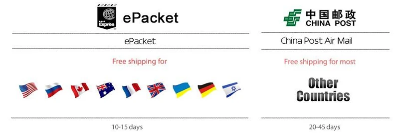 Packages from our warehouse in China will be shipped by ePacket or EMS depending on the weight and size of the product. Packages shipped from our US warehouse are shipped through USPS.