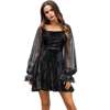 Gothic Style Women Sexy Vintage Black Perspective Mesh patchwork Velvet Fabric Lantern Sleeve Lace-Up Bandage Dresses