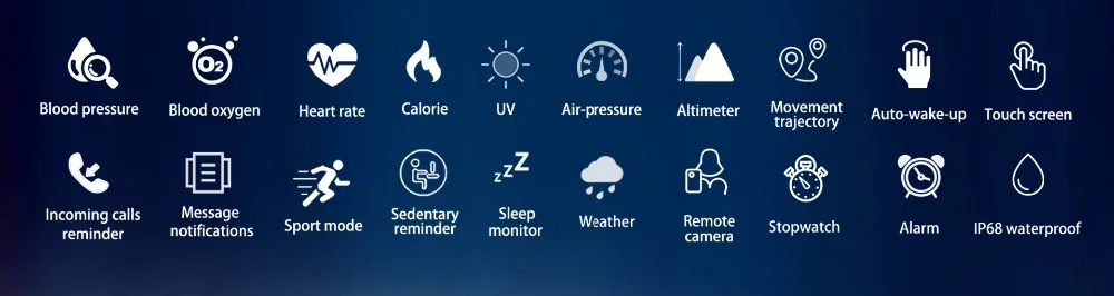 Health tracker, Real-time monitoring of heart rate, sleep quality monitor, Blood pressure, Blood Oxygen Monitoring.