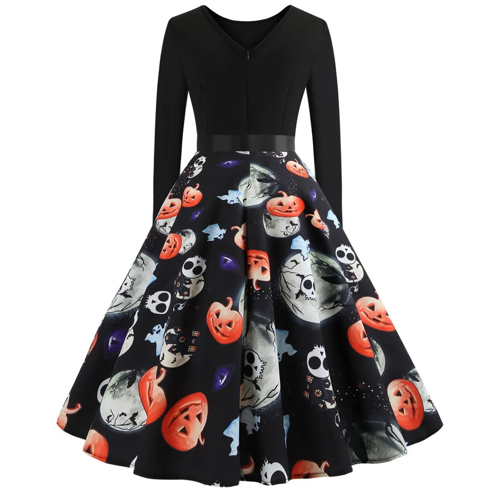 Halloween Party Pumkin Skull Print Vintage Dress With Ribbon Sashes Female Long Sleeve O Neck Retro Vintage Rockabilly Dresses