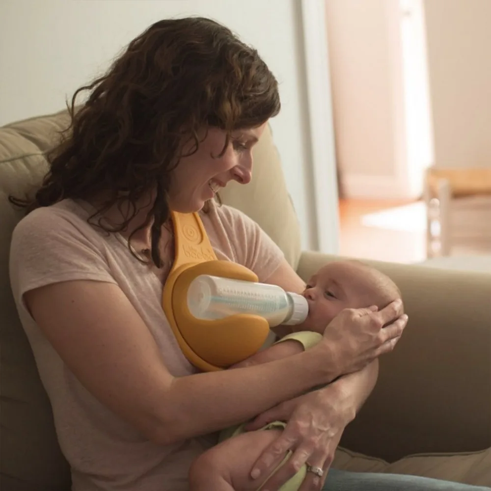 It’s perfect for parents who bottle feed with pumped breast milk or formula. Nursing moms have a free hand; now bottle feeding parents can too!