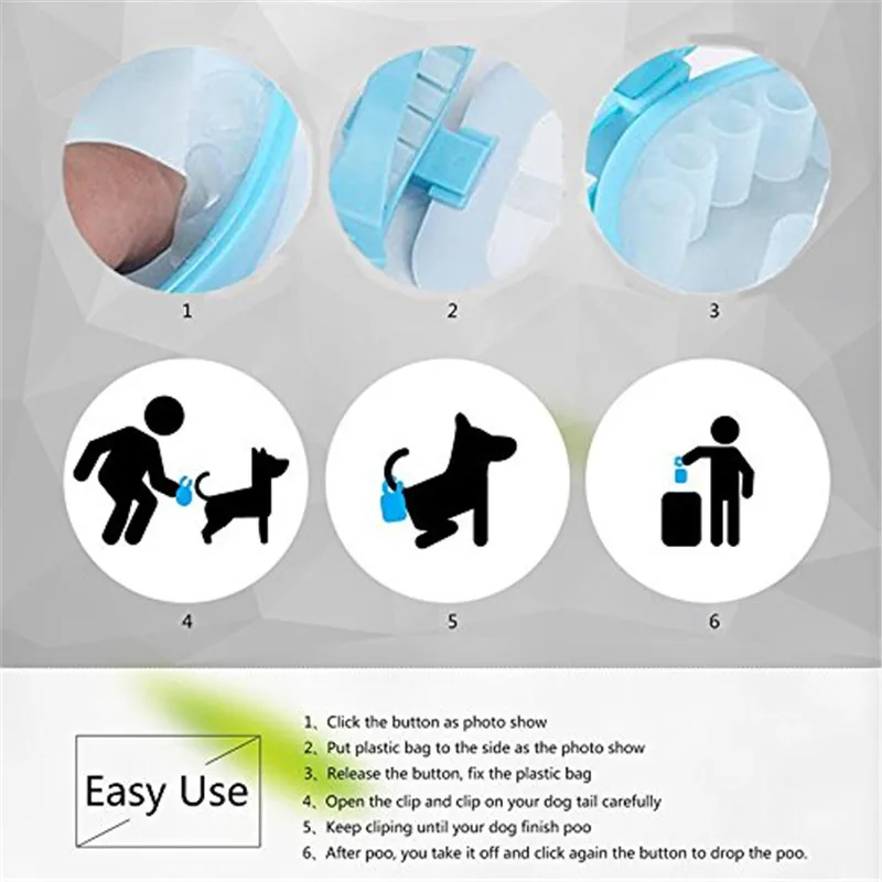 * Portable and Easy Use:Lightweight and small volume.Simple design but useful,One key install waste bag then clip to your dog’s tail,after poop finish one key drop to bin.