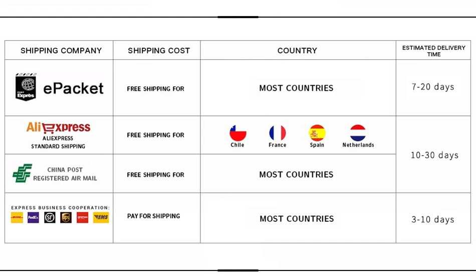 Packages from our warehouse in China will be shipped by ePacket or EMS depending on the weight and size of the product. Packages shipped from our US warehouse are shipped through USPS.