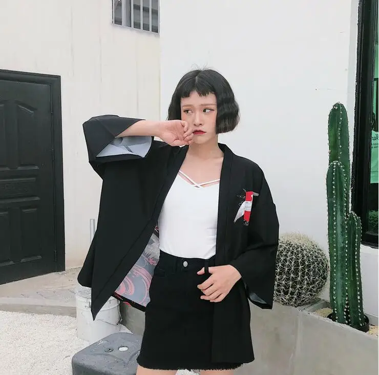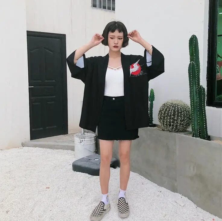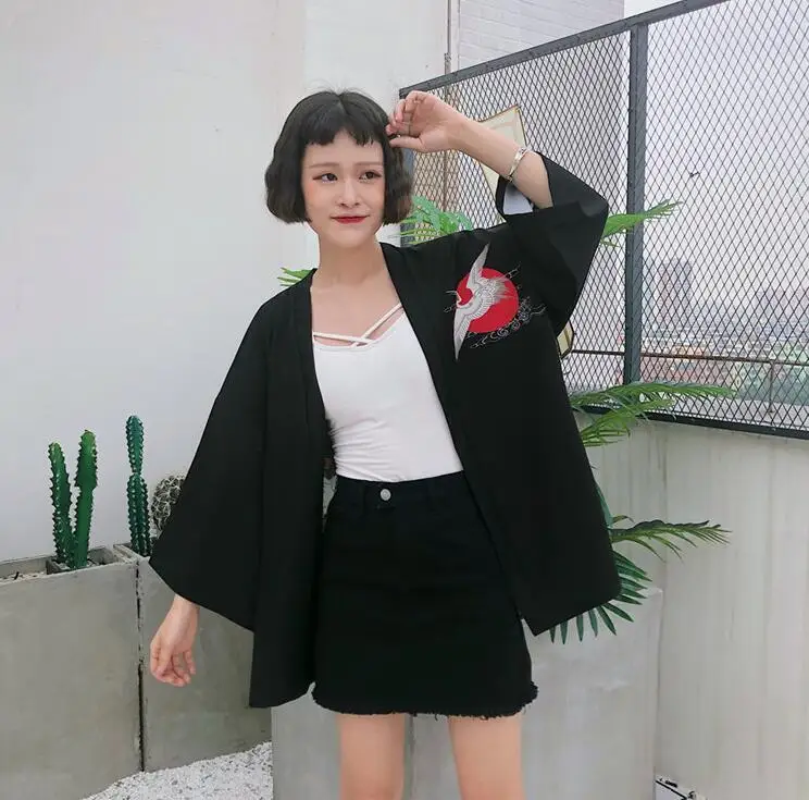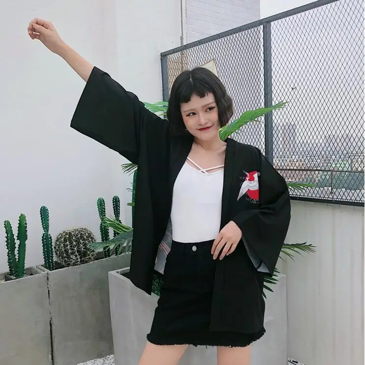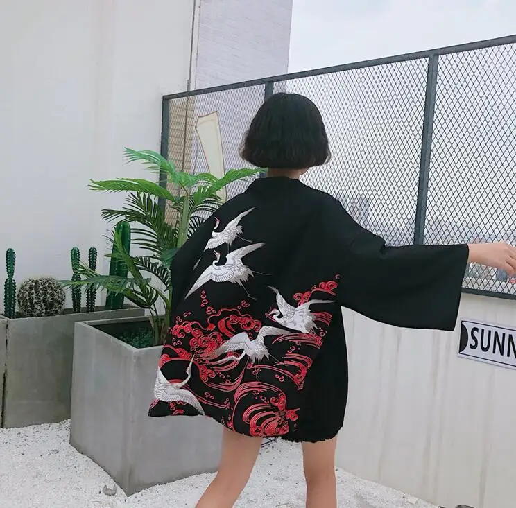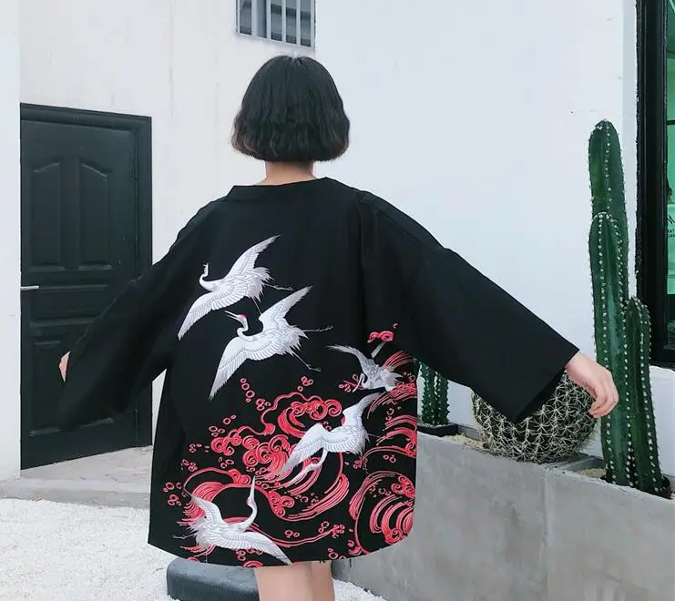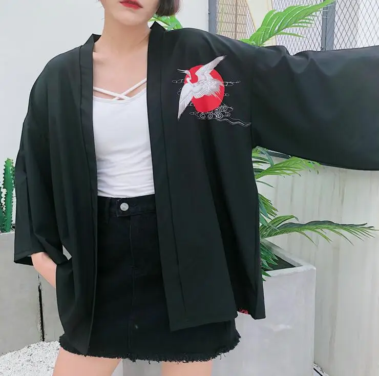 Harajuku bf wind loose crane printing kimono shirt