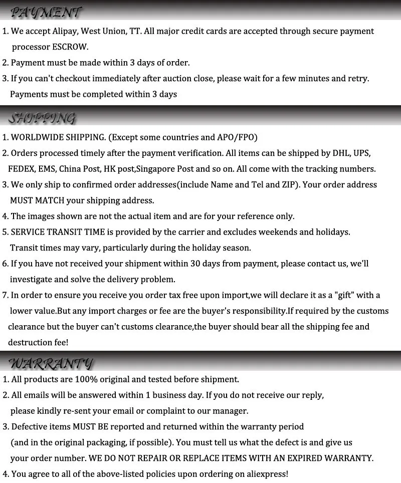 • If you did not receive the product within the guaranteed time( 45 days not including 2-5 day processing) you can request a refund or a reshipment.