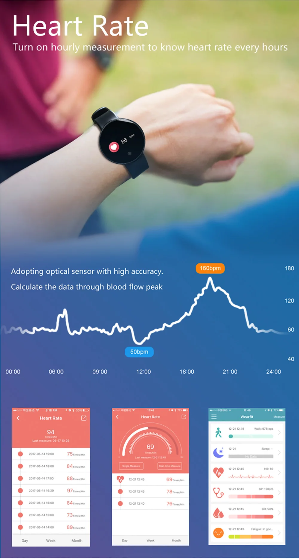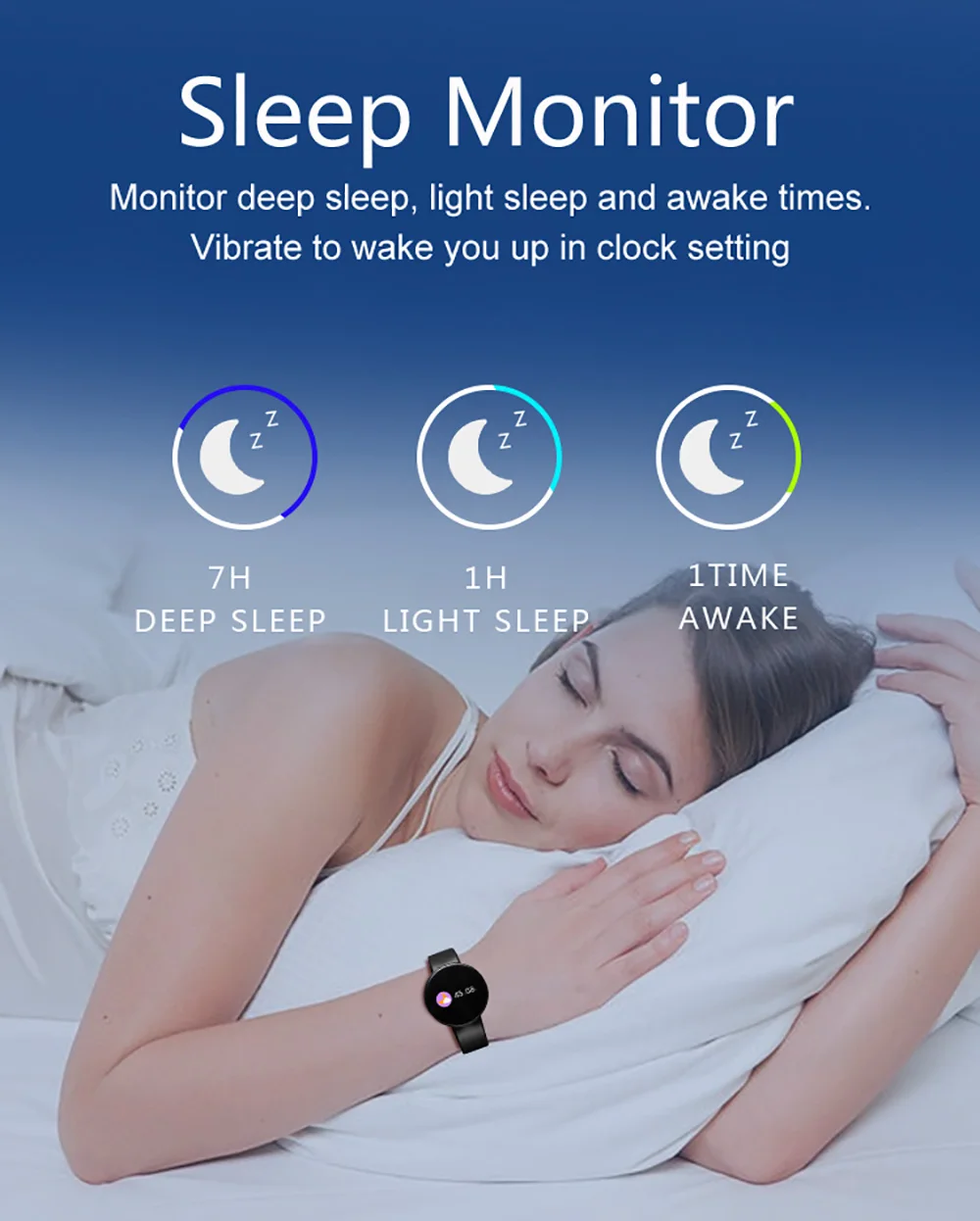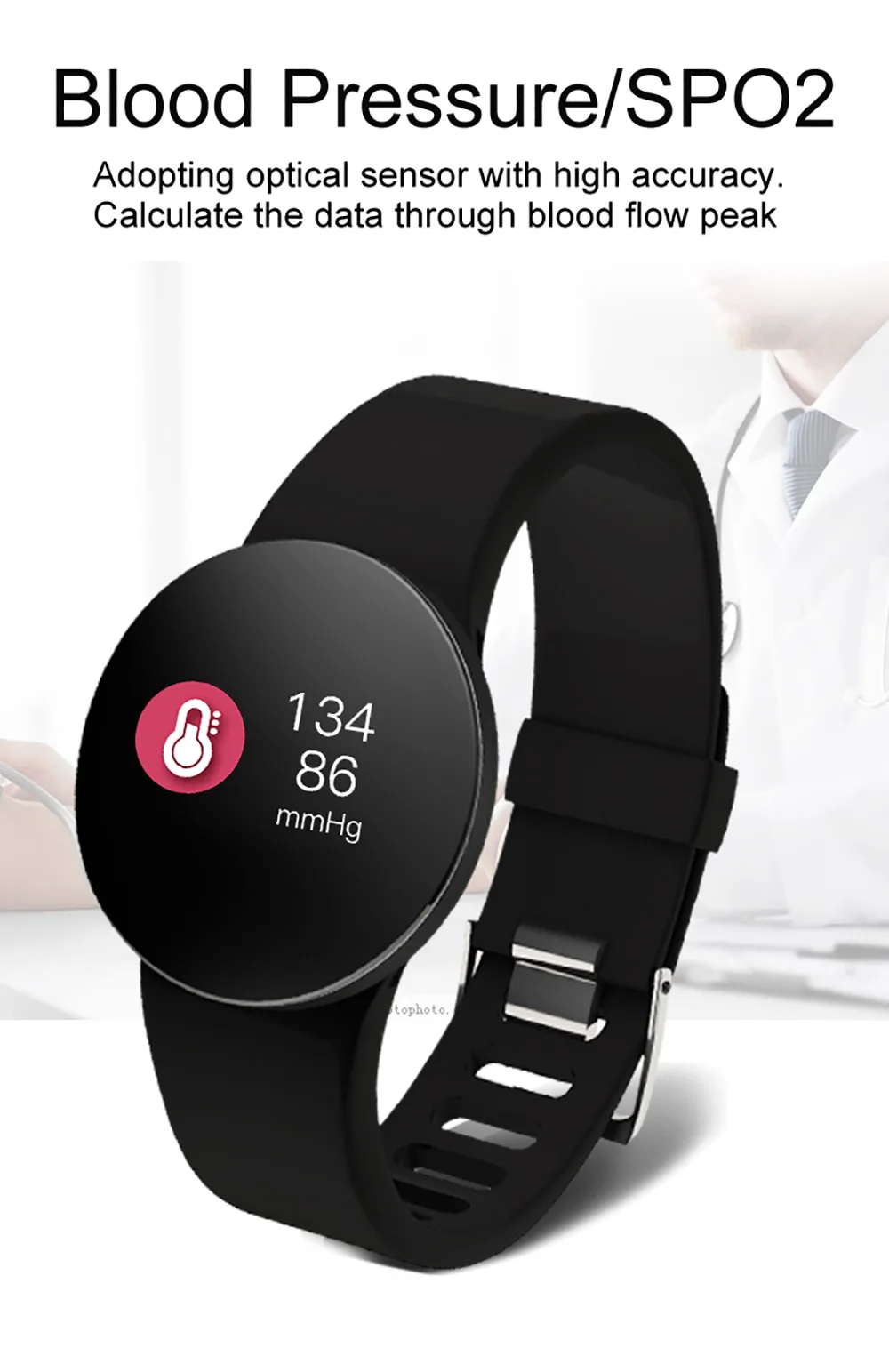 Health monitoring functions: Real time heart rate monitor , blood oxygen monitor, blood pressure monitor, sleep monitoring, sedentary reminder.
